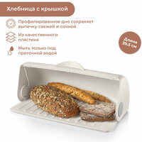 Особая конструкция с крышкой, оснащенной удобной ручкой, и профилированным дном без порога облегчает загрузку и вынимание хлеба. Вы можете легко доставать изделия, не повреждая их и сохраняя их первозданный вид. Нескользящие ножки гарантируют устойчивое размещение хлебницы на любой поверхности, что делает её удобной и безопасной в использовании.
