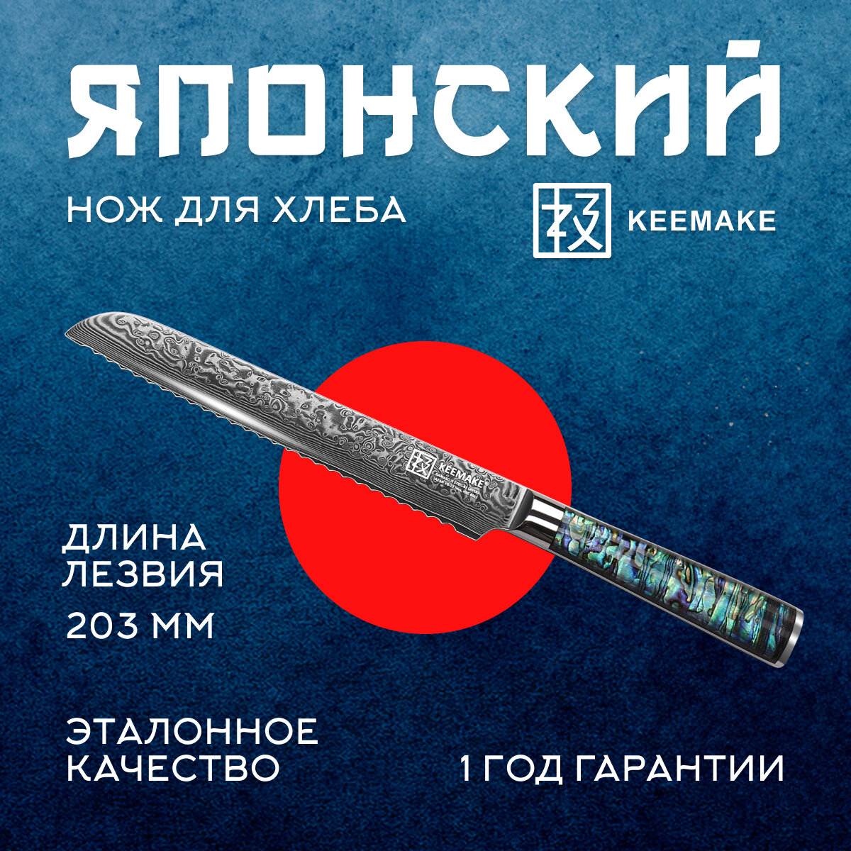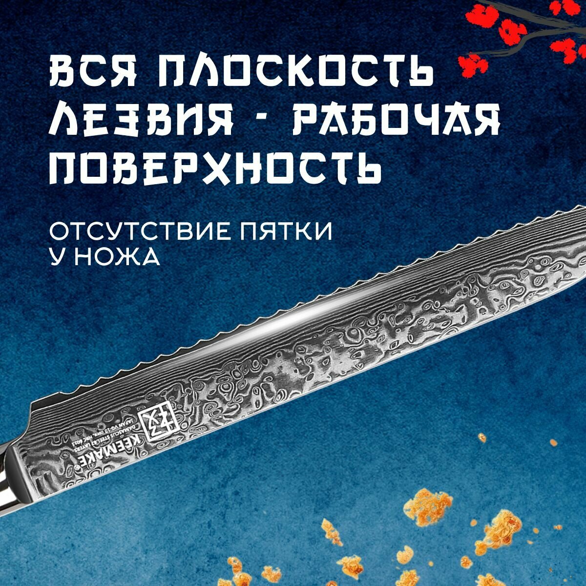 Сердечник ножа Keemake выполнен из высокоуглеродистой стали VG-10 и обложен 67 слоями дамасской стали с добавлением кобальта, ванадия и других компонентов. Многослойность ножа формирует уникальный рисунок на боковых гранях клинка, который выглядит эффектно и привлекает внимание. В процессе изготовления нож Keemake проходит вакуумную термическую обработку с отпуском после закалки, что улучшает твердость, вязкость и общие характеристики клинка. Нож для хлеба от Keemake обладает сверхострым лезвием, симметрично заточенным на водных камнях высокой степени зернистости под минимальным углом с двух сторон. Клинок не требует частых заточек и готов к длительной работе с идеальным и легким резом.
