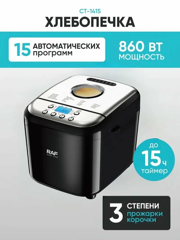 Это значительно упрощает процесс приготовления хлеба и других выпечек. Лёгкий и простой уход обеспечивает антипригарное покрытие пекарной камеры и лопатки. Металлическая автоматическая хлебопечка с замесом теста превосходно впишется в дизайн любой кухни и будет долго радовать вас не только ароматом свежего хлеба, но и внешним видом. Печка для выпечки хлеба с тесто месом – ваш персональный микро хлебозавод, который станет незаменимым помощником на вашей кухне и позволит наслаждаться ароматным и вкусным хлебом каждый день. 2 тестомеса обеспечивают лучшее замешивание теста, а возможность добавления ингредиентов во время приготовления позволяет контролировать процесс в хлебопечи и получать идеальный результат. Удобная панель управления хлеба печи с замесом с LCD-дисплеем позволяет легко выбрать подходящий режим и настроить один из трёх возможных цветов корочки. С помощью программируемого таймера вы сможете отложить старт работы хлебо печи с замесом до 15 часов, а функция поддержания температуры готовой выпечки в течение часа позволит сохранить тепло и аромат хлеба на долгое время. Компактная печь для выпечки хлеба с теплоизолированным корпусом и смотровыми окошками на крышке имеет 15 автоматических программ и запас памяти при сбое электропитания на 15 минут. Хлебопечка с замесом автоматическая теста 1.5 кг универсальный кухонный прибор, который поможет вам приготовить ароматный и вкусный ароматный хлеб с хрустящей корочкой. Благодаря функции замеса теста, печь хлебопекарная избавляет от необходимости ручной тестозамески. Она также может использоваться для приготовления йогуртов и джемов. Хлебопечь с замесом теста электрическая обладает всеми необходимыми функциями для создания идеальной выпечки хлеба. Современные материалы делают автоматическую хлебопечку с замесом 1.5 кг абсолютно безопасной в использовании и невероятно привлекательной внешне, а также обеспечивают ей максимально долгий срок службы. КомплектацияПекарня-1. Хлебница- 1 шт. Лопатка для замешивания теста-2 шт. Соединить чашки-1. Ложка-1 шт. Крючок-1. Руководство пользователя-1. F97B