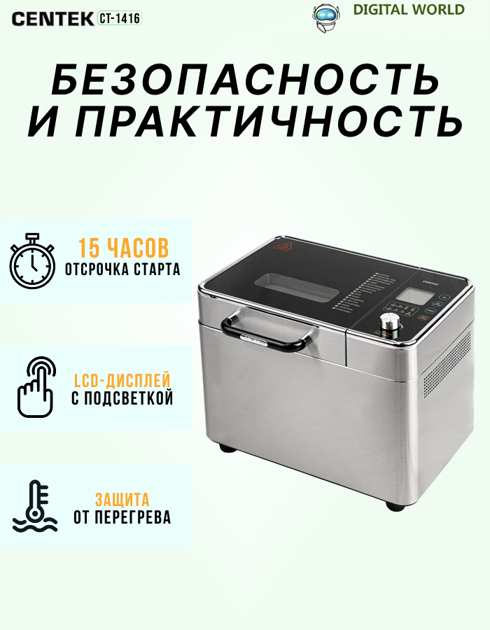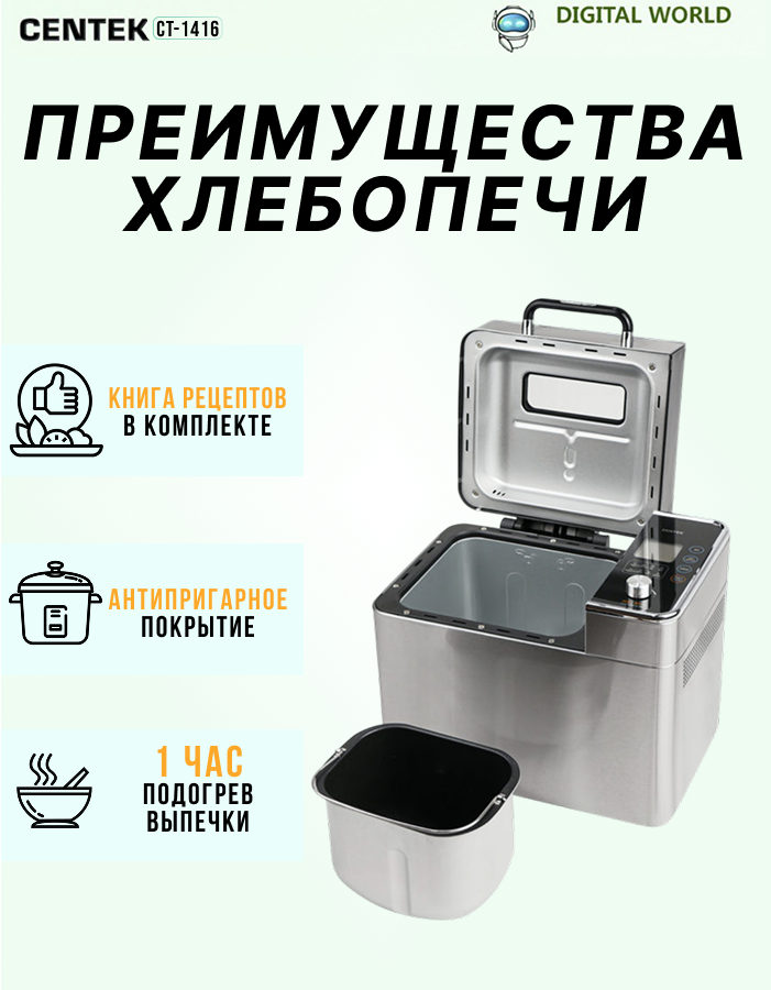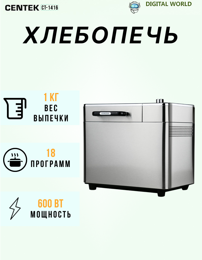 Хлебопечка Centek CT-1416 - это стильный и функциональный кухонный помощник, который позволит вам наслаждаться свежим и ароматным хлебом каждый день.