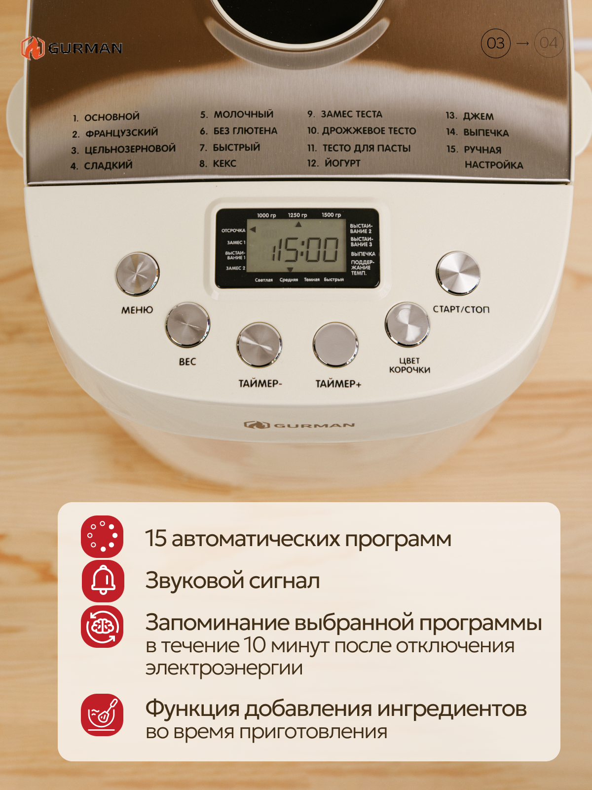 Купить Хлебопечка GURMAN GR-BM2000 с антипригарным покрытием, 15 программ с доставкой по всей России. Хлебопечка GURMAN GR-BM2000 с антипригарным покрытием, 15 программ: сравнение цен, характеристики, фото, актуальное наличие и цены.