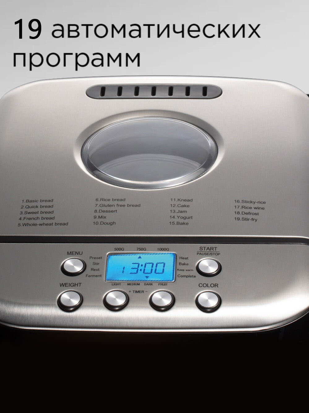 Купить Хлебопечка с замесом теста, 19 автоматических программ, корпус из нержавеющей стали, сенсорное управление с доставкой по всей России.