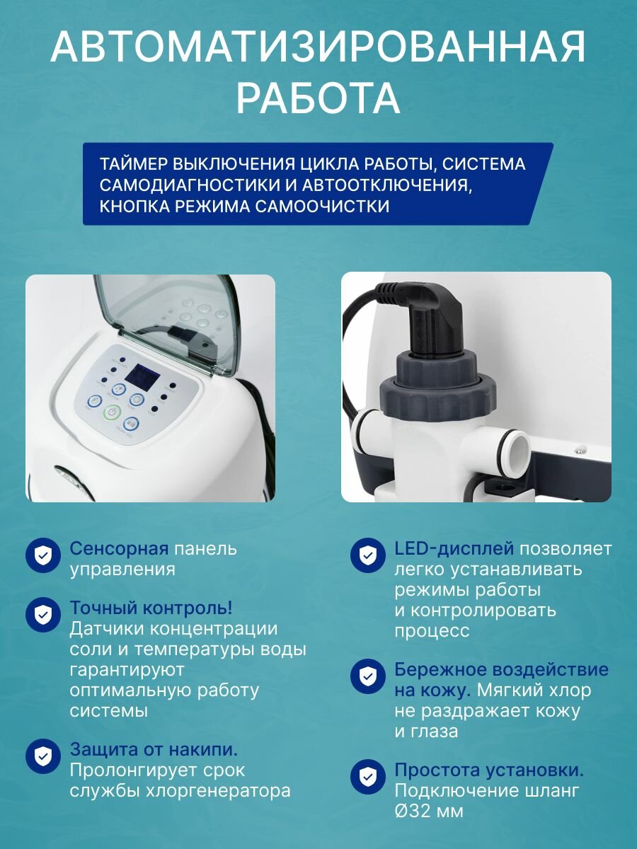 Компания Intex объединила эти две превосходные системы в один продукт, предоставив владельцам наземных бассейнов недорогой, не требующий особого ухода продукт, который будет поддерживать чистоту, безопасность и комфорт бассейнов для пловцов. Обе системы санитарии автоматически контролируются с помощью 24-часового таймера.