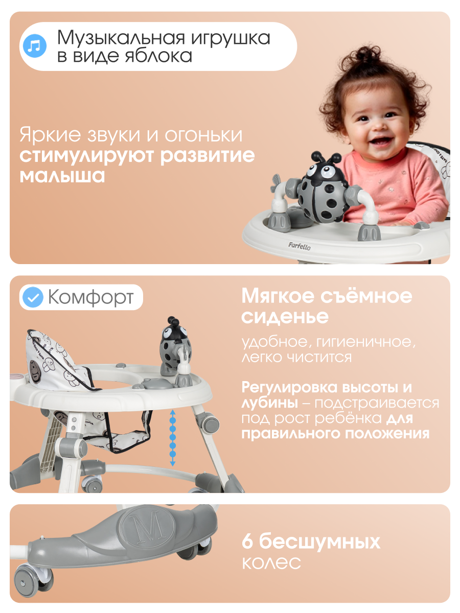 Ходунки детские Farfello A3, для детей от 6 до 18 месяцев, до 12 кг, игровая панель, цвет серый: сравнение цен, характеристики, фото, актуальное наличие и цены.