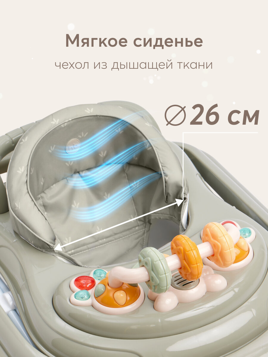 Классические ходунки SMILEY V2 развивают координацию движений и помогут ребёнку научиться держать равновесие. Мягкие цвета ходунков привлекут внимание ребенка. Игровая панель со звуковыми эффектами и игрушками поможет развить у малыша зрение, слух, хватательный рефлекс и мелкую моторику. Мягкое, удобное сиденье легко регулируется в 3-х положениях в зависимости от роста. Ходунки SMILEY V2 оборудованы специальными силиконовыми колесами, которые не поцарапают напольное покрытие. Игровая панель работает от 2-х пальчиковых батареек (тип АА).