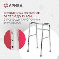 Ходунки шагающие Армед KR913L – надежная и удобная модель из легкого и прочного металлического сплава. Ходунки могут использоваться в двух положениях, а высоту удобно подстраивать под рост пользователя (см. фото).