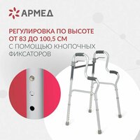 Высота ходунков регулируется за счет телескопического механизма с кнопочным фиксатором, что позволяет использование ходунков пользователями разного роста.