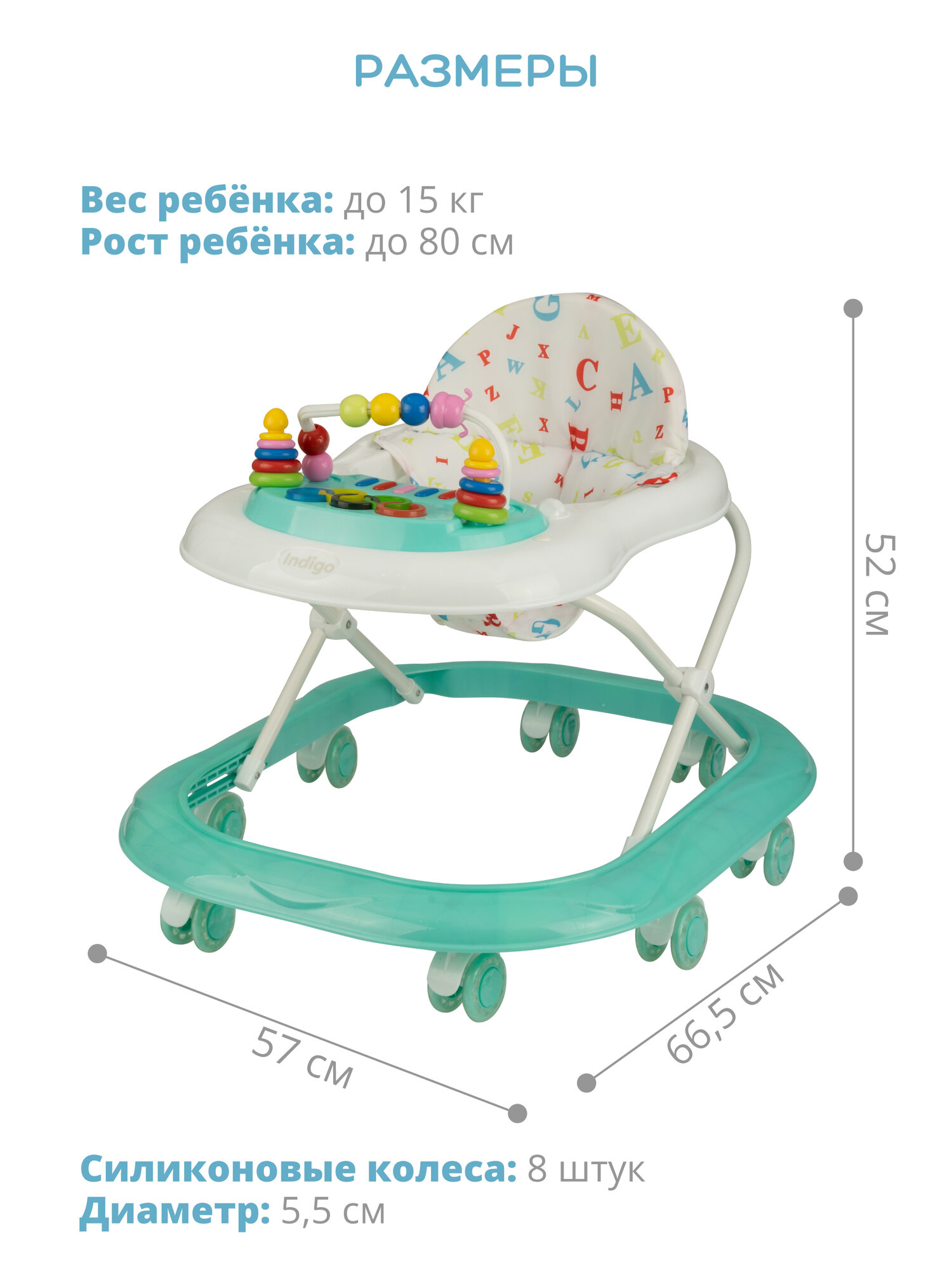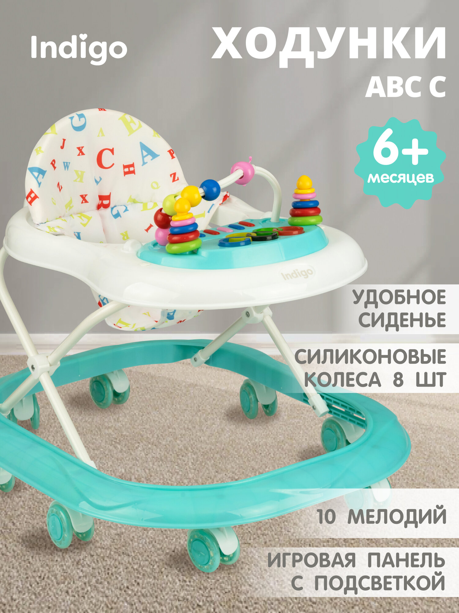 Ходунки музыкальные INDIGO ABC C, силиконовые колеса, подсветка, бирюзовый: сравнение цен, характеристики, фото, актуальное наличие и цены.