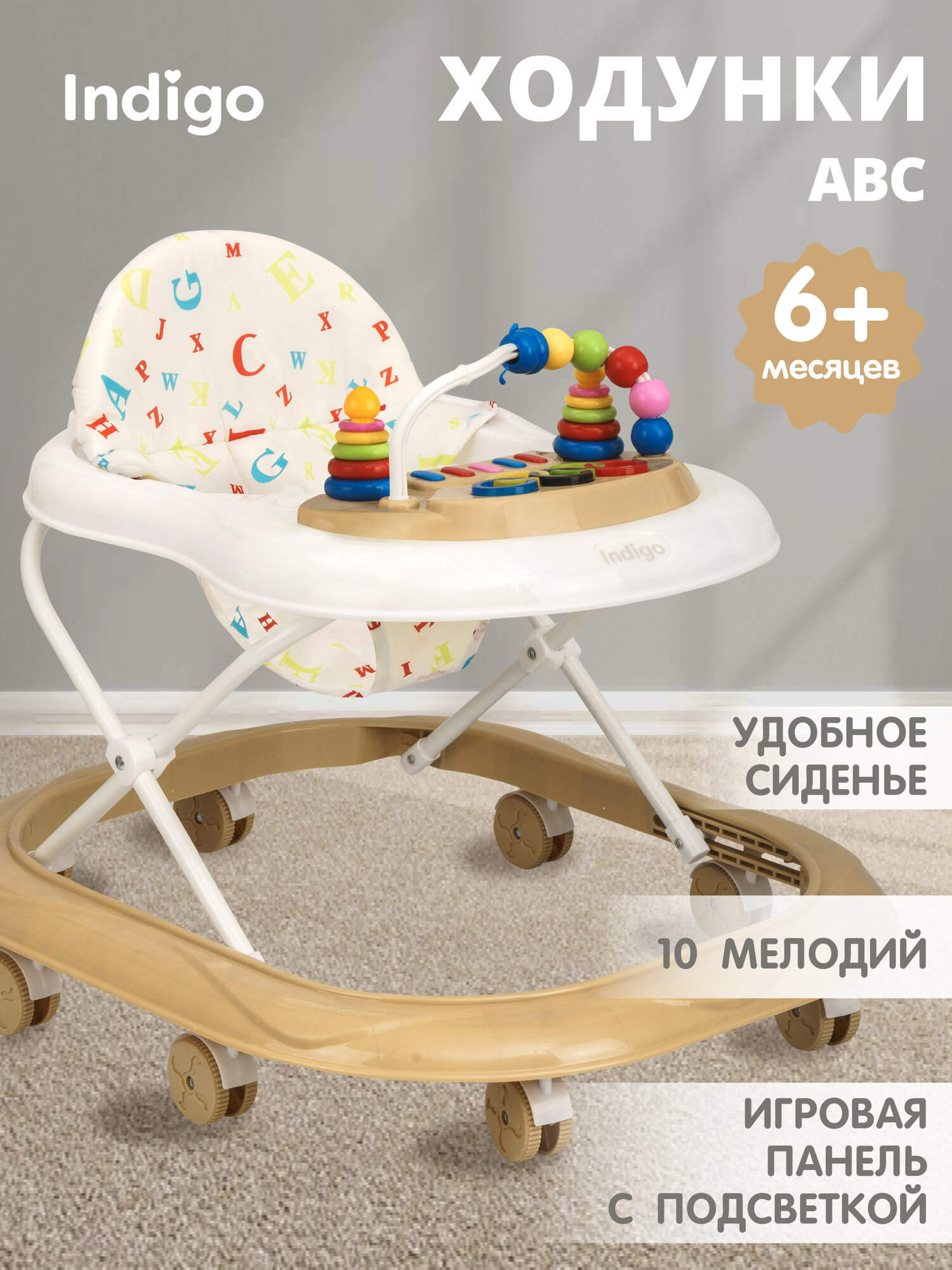 Ходунки музыкальные INDIGO ABC, с подсветкой, 8 колес, бежевый-белый: сравнение цен, характеристики, фото, актуальное наличие и цены.