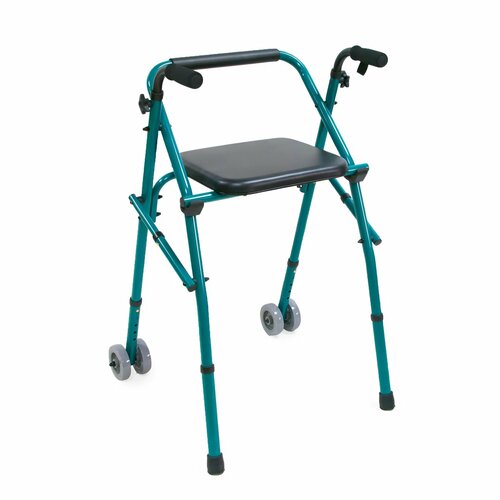 Конструкция ходунков выполнена из анодированного алюминия с полимерным покрытием и не подвергается коррозии. Передние опоры оснащены колесами для облегчения передвижения и большей мобильности. Встроенное в конструкцию сиденье из искусственной кожи позволяет использовать ходунки как стул. Ходунки просто складываются и не занимают много места, имеют 5 положений регулировки высоты с шагом в 2,5 см. Рукоятки съемные, мягкие накладки на рукоятках ходунков не дают рукам скользить. Резиновые наконечники, расположенные на опорах, предохраняют от скольжения по твердым поверхностям.