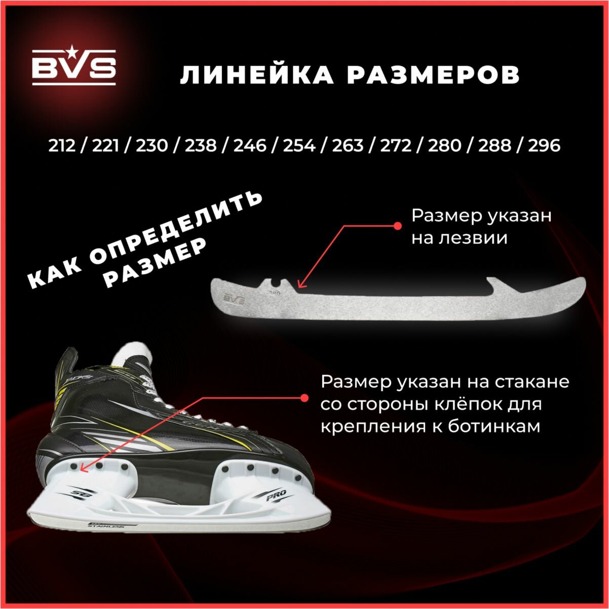 Для производства хоккейных лезвий BVS специально подобрана марка высококачественной стали. Авторская закалка обеспечивает твёрдость 46−50 HRС. Такая сталь позволяет лезвиям хоккейных коньков сопротивляться ударам, возникновению заусениц и сколов. Сохраняет прочность, не перегревается при заточке, устойчива к перепадам температур, не образует трещин