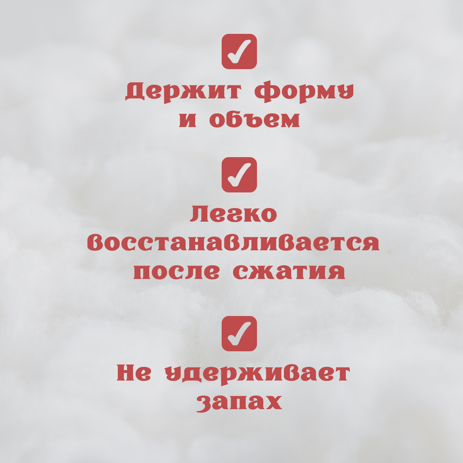 Применение в качестве наполнителя: подушек и одеял игрушек и аксессуаров мягкой мебели верхней одежды предметов декора в качестве утеплителя Преимущества: легко восстанавливает форму и объем после сжатия гипоаллергенный и экологичный не впитывает влагу не заводятся клещи и клопы не боится стирок долговечность и неприхотливость в уходе отличные теплорегулирующие свойства легкость и мягкость хорошо пропускает воздух не впитывает посторонние запахи износостойкость и долговечность не скатывается и не рассыпается безопасен для детей безопасен для животных безопасен для беременных