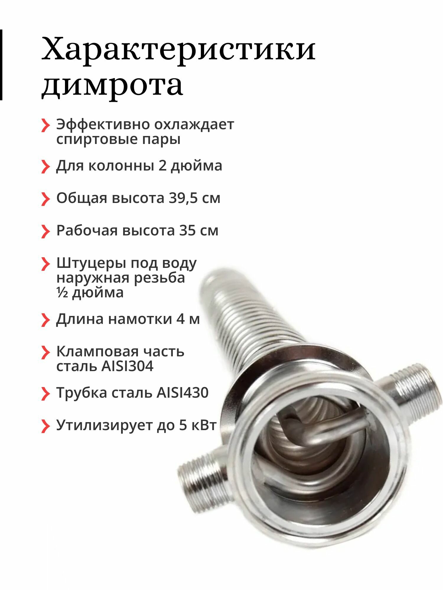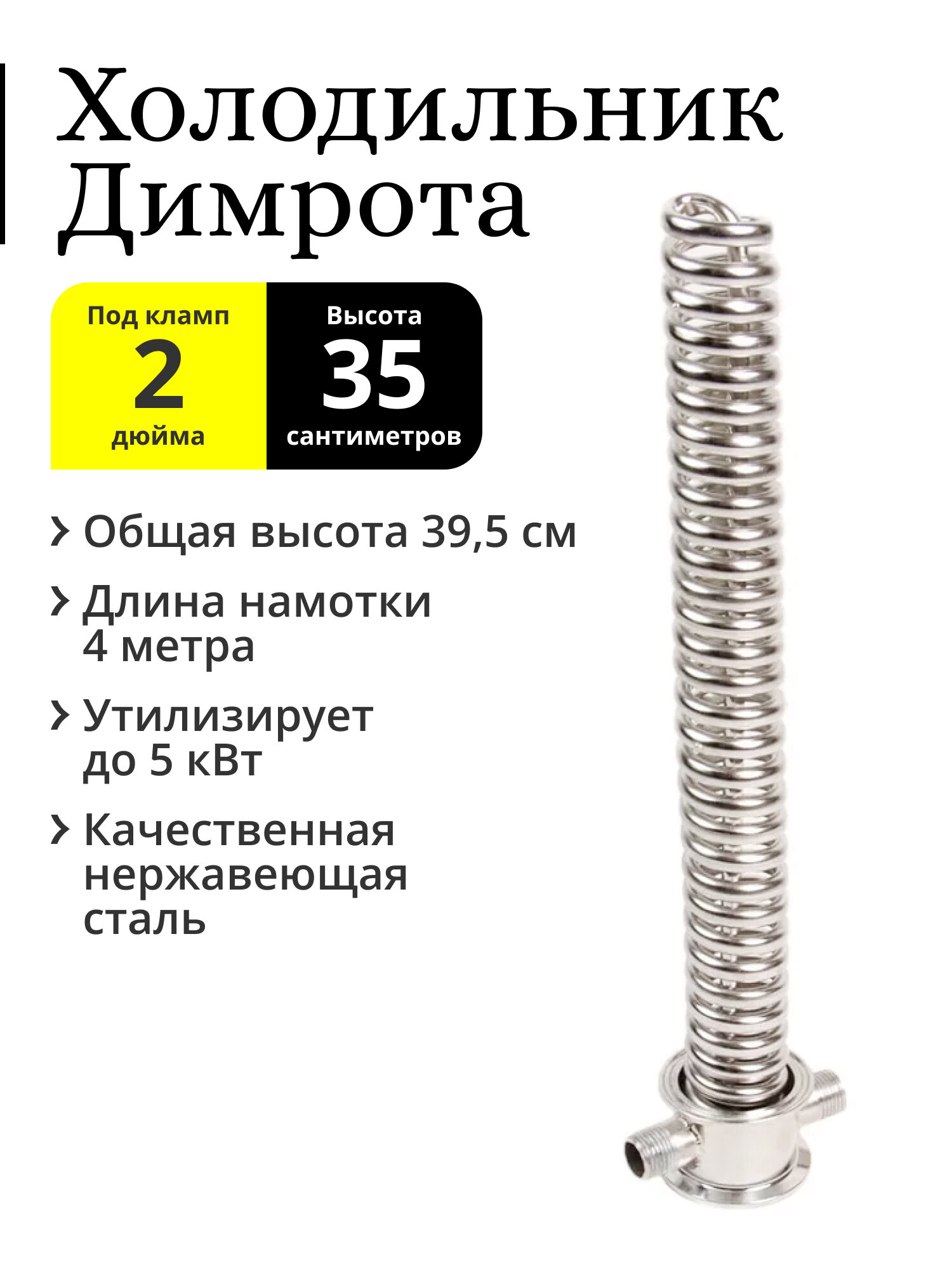 Холодильник Димрота предназначен для эффективного охлаждения и конденсации спиртовых паров во время перегонки. Представляет собой спираль с водяным охлаждением.