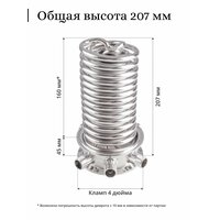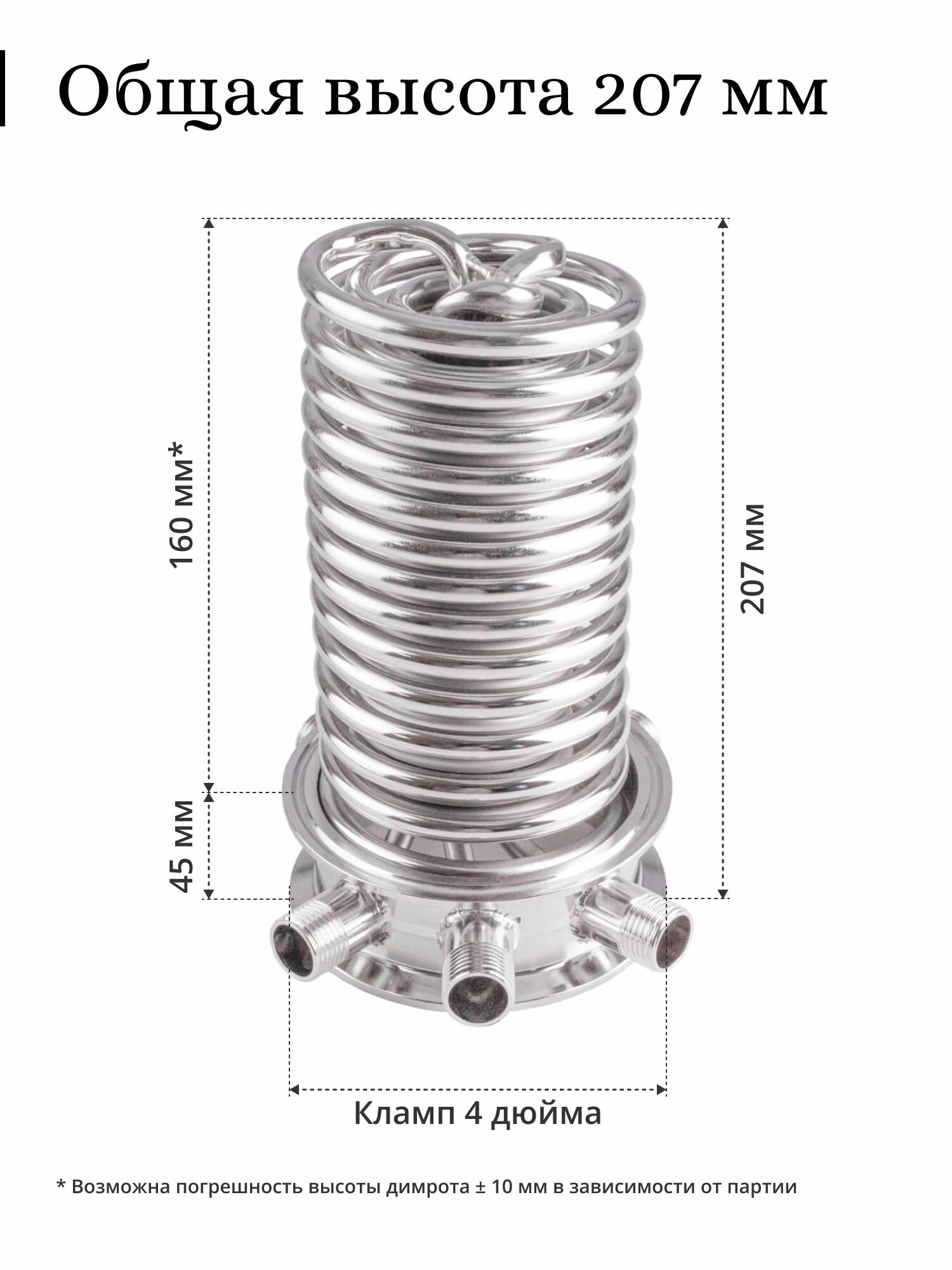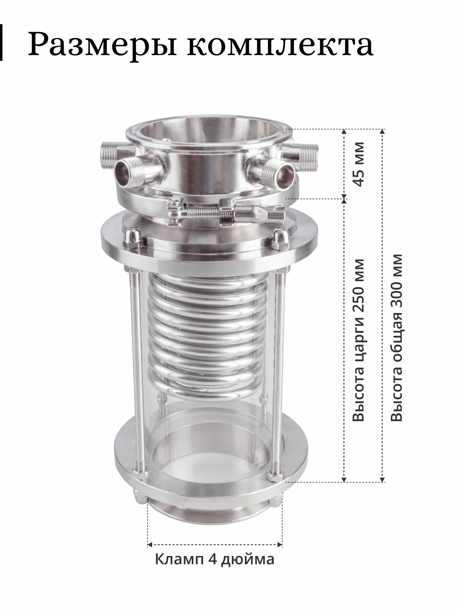Холодильник Димрота 4 дюйма 15 см — 1 шт; Царга стеклянная под кламп 4 дюйма, 25 см — 1 шт; Прокладка под кламп 4 дюйма — 1 шт; Хомут под кламп 4 дюйма, нержавеющая сталь — 1 шт.