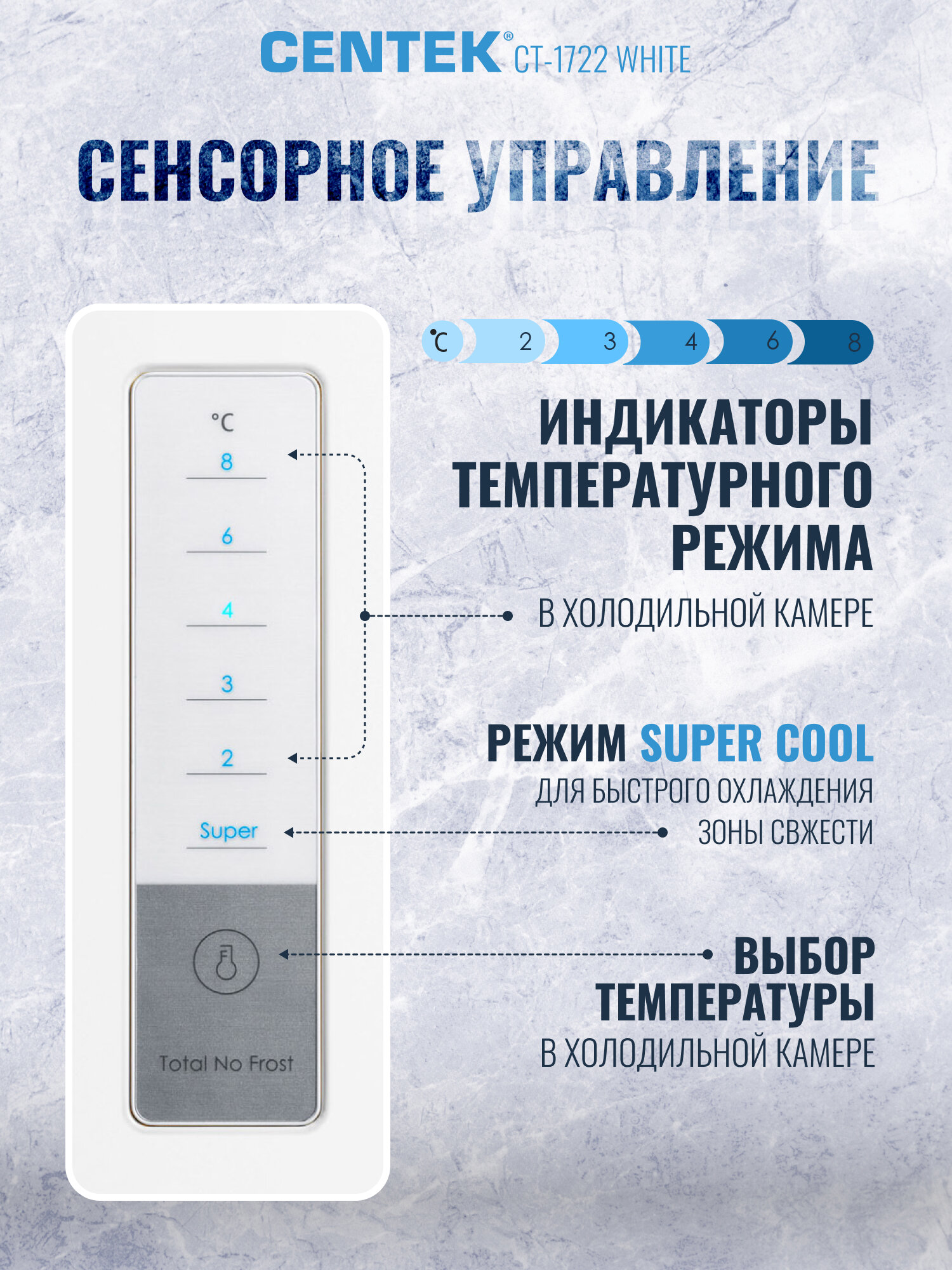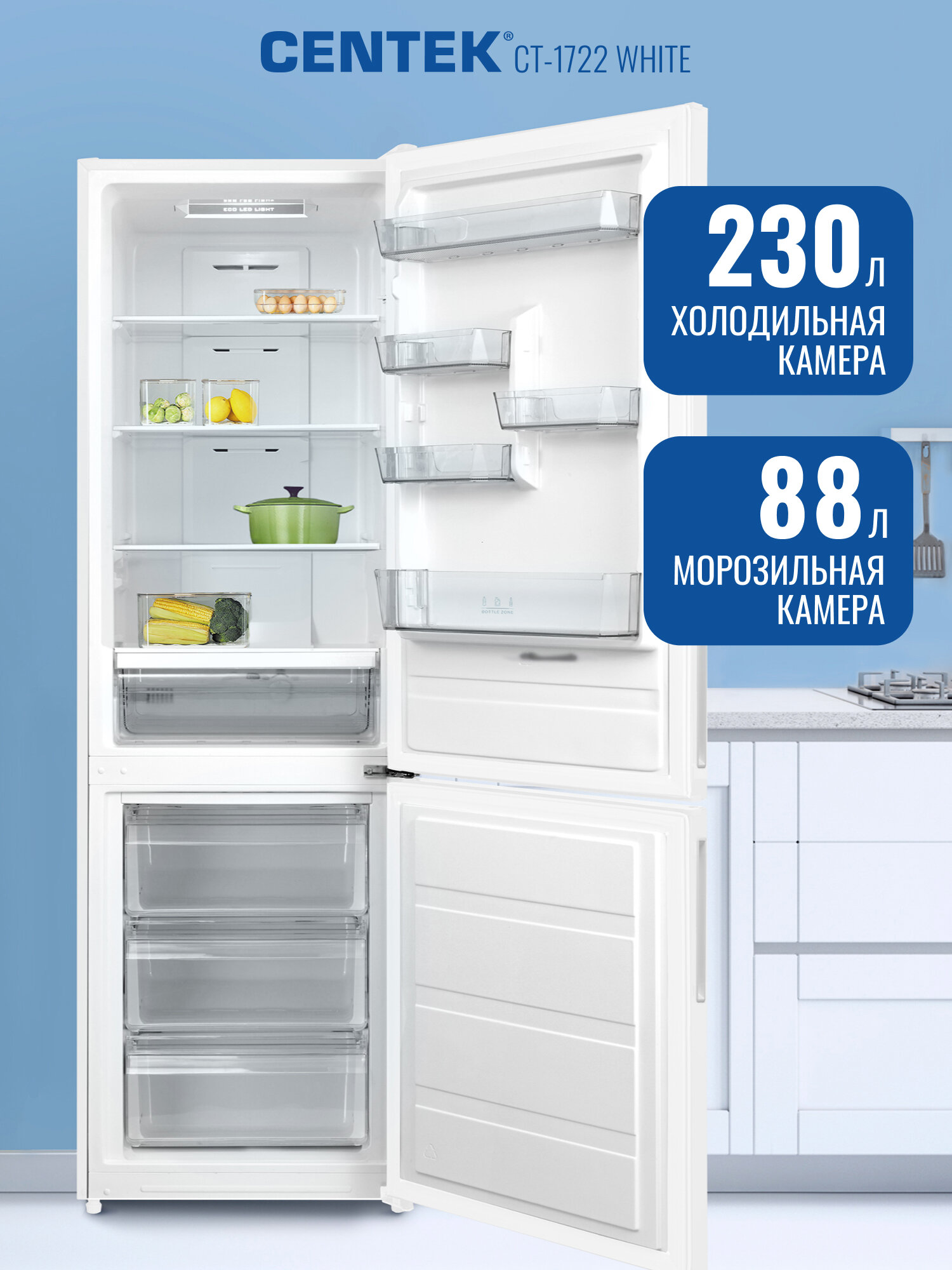 Холодильник двухкамерный ноу фрост Centek CT-1722 NF White: 318л (88л/230л) 60х63х188см(ШхГхВ), А+, компрессор GMCC: сравнение цен, характеристики, фото, актуальное наличие и цены.