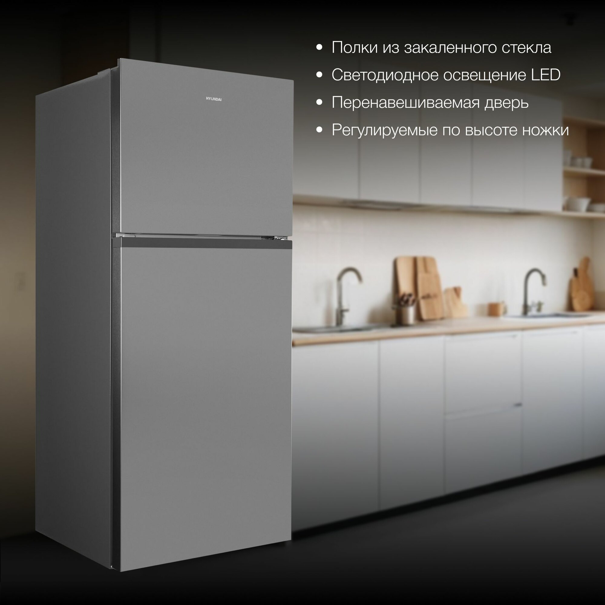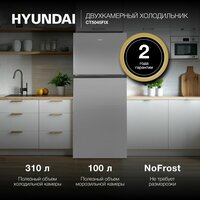 Холодильник двухкамерный с верхней морозильной камерой HYUNDAI CT5045FIX, NoFrost Инвертор, Объем 490л, Класс A++, Уровень шума 43 дБ, LED освещение, Высота 186 см, Нерж сталь
