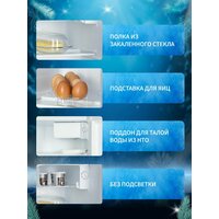 | Дополнительная информация | 7 режимов охлаждения, освещение - лампа 10 Вт, 2 полки на дверце, подставка для яиц 1*6 шт., регулируемая высота полок, съемные моющиеся уплотнители |
