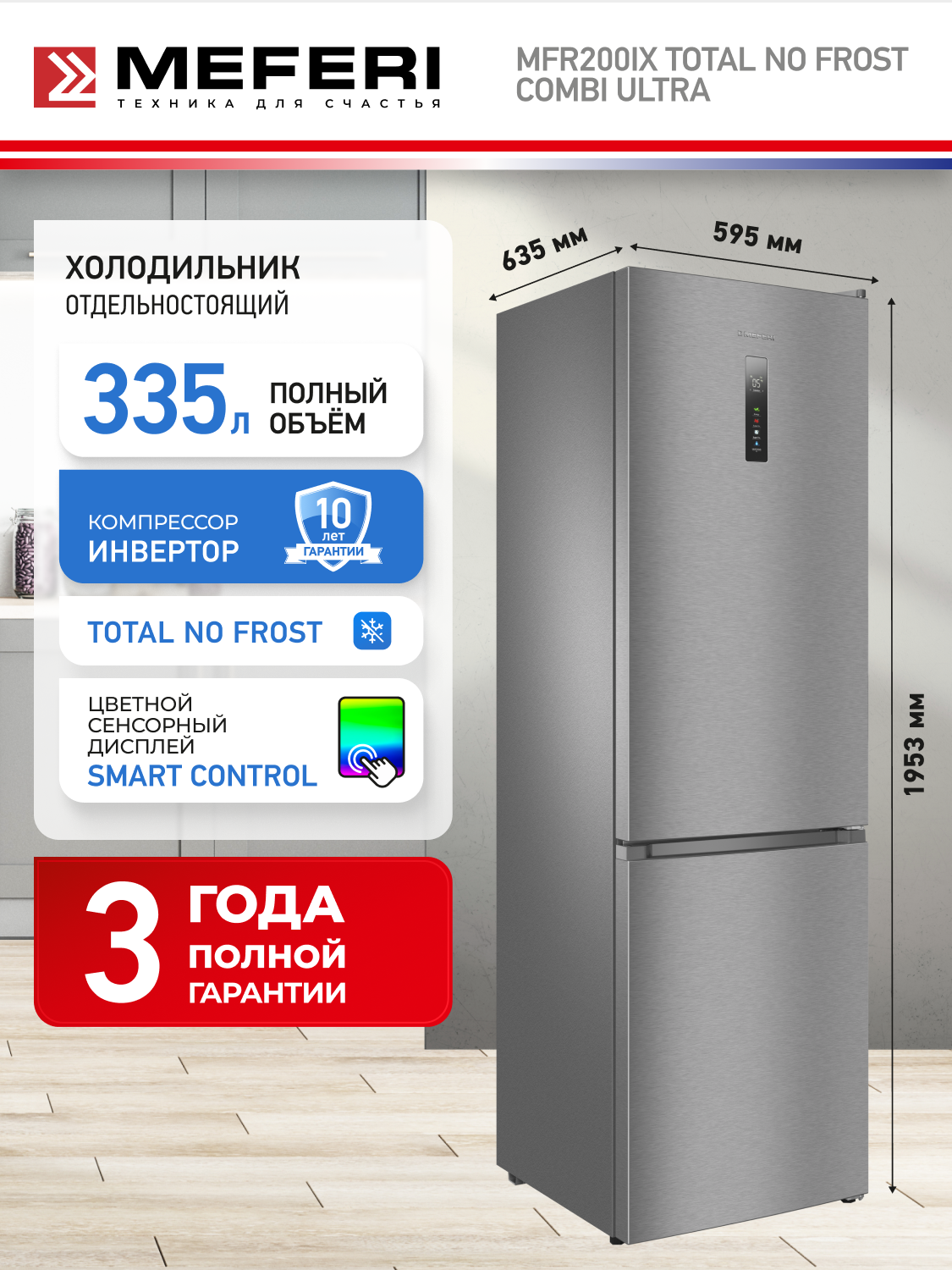 Холодильник отдельностоящий с инвертором MEFERI MFR200IX TOTAL NO FROST COMBI ULTRA: сравнение цен, характеристики, фото, актуальное наличие и цены.