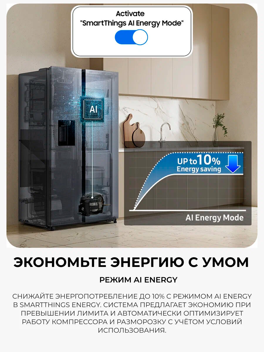 - Автооткрытие двери, AI Energy Mode и сигнализация открытой двери — всё для удобства и безопасности.