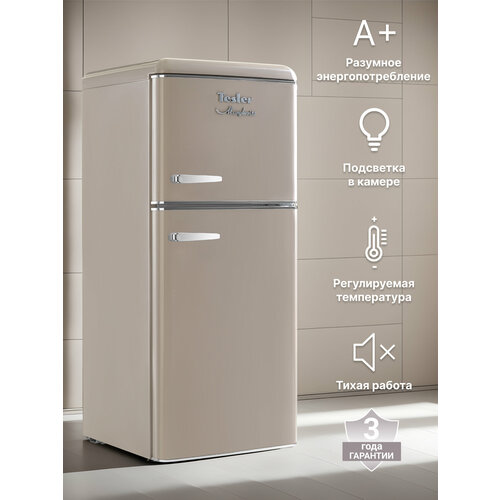 Функциональный и элегантный, двухкамерный холодильник Tesler RT-152 предлагает все необходимое для эффективного охлаждения продуктов. Несмотря на сравнительно небольшие габариты, он оборудован полноценной морозильной камерой, в которой поддерживается температура -18°С. Эргономичный дизайн внутреннего пространства помогает с комфортом расположить еду и напитки. Холодильное отделение предоставляет полезный объем 89 л, внутреннее освещение облегчает просмотр содержимого. Съемные стеклянные полки можно переставить удобным образом, а внизу располагается вместительный ящик для овощей и фруктов. В дверце помимо полок есть отдел для хранения банок, из которого легко доставать напитки. В отделение помещается 6 банок. Морозильное отделение с полезным объемом 38 л предлагает достаточно места для замораживания продуктов, и разделено на две части для удобства сортировки продуктов. В дверце также есть одна небольшая полка. Благодаря ручной системе размораживания поддерживать чистоту в холодильнике не составит труда. Механический термостат, расположенный в холодильном отделении, позволит создать внутри оптимальные условия хранения в зависимости от окружающей температуры. Регулируемые ножки помогут не только подобрать комфортную высоту, но и удерживать холодильник в равновесии даже на неровных поверхностях. Tesler RT-152 сочетает в себе надежное охлаждение, элегантность и функциональность. Выполненный в ретро-стиле, он придаёт особый шарм пространству вокруг, что делает его идеальным дополнением к кухне. Хромированные ручки с надёжным креплением не ослабнут независимо от того, как часто вы открываете дверцы. Холодильник RT-152 SAND GREY прекрасно сочетается с чайником, тостером и термопотом комплектов Elizabeth и Margherita. Приобретённая в дополнение к холодильнику, техника Tesler в ретро-стиле сделает интерьер кухни гармоничным и запоминающимся. Модель доступна в черном, красном, бежевом, песочно-сером, зеленом и желтом цвете.