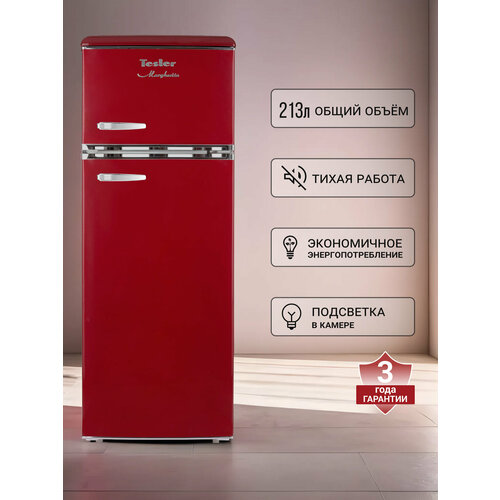 Функциональный и элегантный, двухкамерный холодильник Tesler RT-215 предлагает все необходимое для эффективного охлаждения продуктов. Несмотря на сравнительно небольшие габариты, он оборудован полноценной морозильной камерой, в которой поддерживается температура -18°С. Эргономичный дизайн внутреннего пространства помогает с комфортом расположить еду и напитки. Холодильное отделение предоставляет полезный объем 89 л, внутреннее освещение облегчает просмотр содержимого. Съемные стеклянные полки можно переставить удобным образом, а внизу располагается вместительный ящик для овощей и фруктов. В дверце помимо полок есть отдел для хранения банок, из которого легко доставать напитки. В отделение помещается 6 банок. Морозильное отделение с полезным объемом 38 л предлагает достаточно места для замораживания продуктов, и разделено на две части для удобства сортировки продуктов. В дверце также есть одна небольшая полка. Благодаря ручной системе размораживания поддерживать чистоту в холодильнике не составит труда. Механический термостат, расположенный в холодильном отделении, позволит создать внутри оптимальные условия хранения в зависимости от окружающей температуры. Регулируемые ножки помогут не только подобрать комфортную высоту, но и удерживать холодильник в равновесии даже на неровных поверхностях. Tesler RT-215 сочетает в себе надежное охлаждение, элегантность и функциональность. Выполненный в ретро-стиле, он придаёт особый шарм пространству вокруг, что делает его идеальным дополнением к кухне. Хромированные ручки с надёжным креплением не ослабнут независимо от того, как часто вы открываете дверцы. Холодильник RT-215 RED прекрасно сочетается с чайником, тостером и термопотом комплектов Elizabeth и Margherita. Приобретённая в дополнение к холодильнику, техника Tesler в ретро-стиле сделает интерьер кухни гармоничным и запоминающимся. Модель доступна в черном, красном, бежевом, песочно-сером, зеленом и желтом цвете.