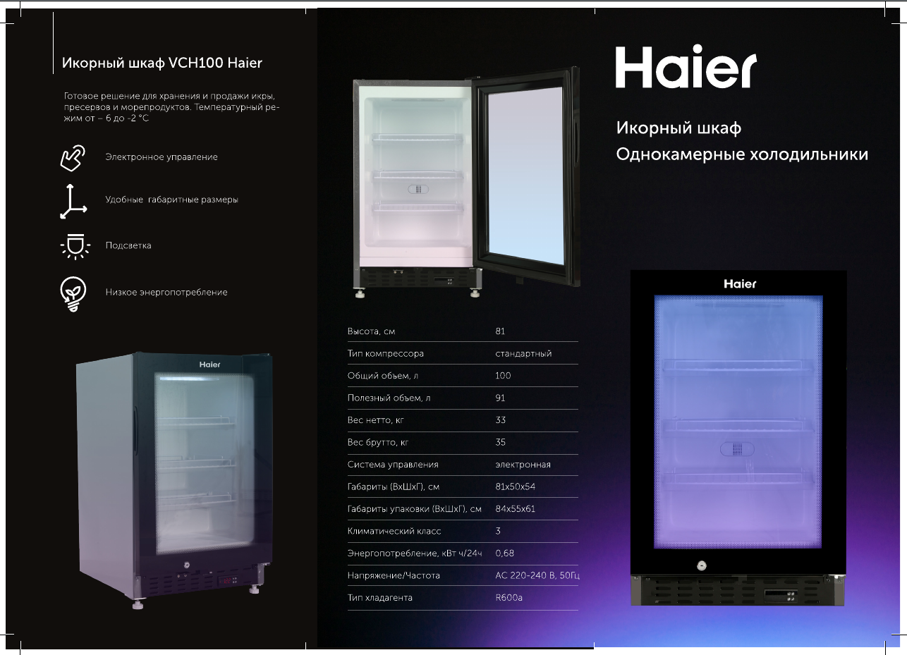 Холодильный шкаф Haier VCH100-готовое решение для хранения, демонстрации и продажи икры, рыбных пресервов и морепродуктов на предприятиях общественного питания и торговли. Модель оснащена электронной системой управления, 3 внутренними полками, подсветкой и регулируемыми по высоте опорами.