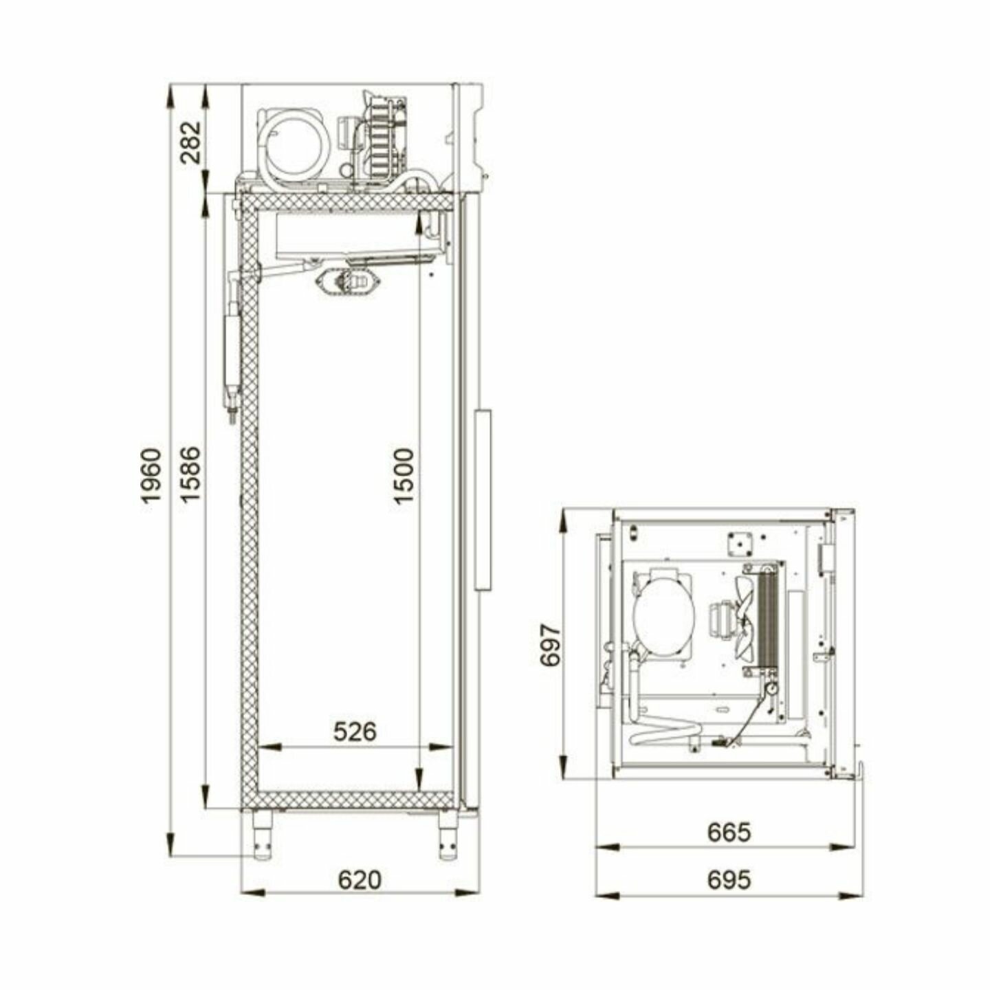 - Внутренние габариты: высота - 1500 мм, ширина - 611 мм, глубина - 526 мм