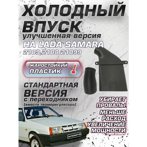 - Холодный впуск на ВАЗ 2108, 2109, 21099. Устанавливается штатно без переделок. Спроектирован С учётом оригинальных размеров 1980х годов (схожие воздухозаборники штатно ставились на самары комплектации люкс)