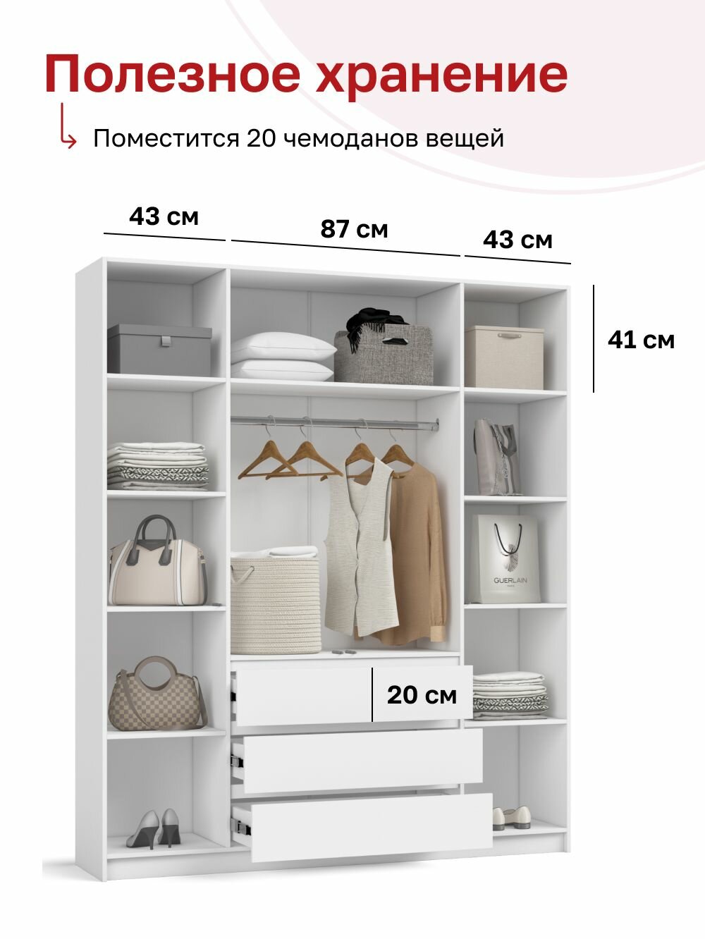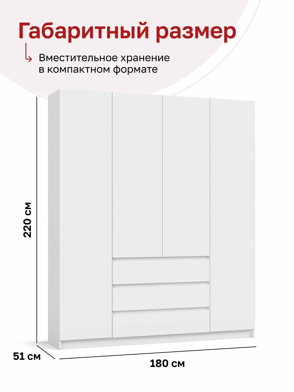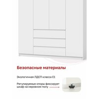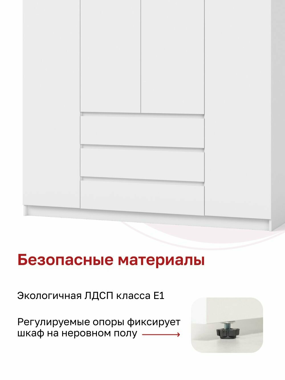 Вместительный четырехстворчатый распашной шкаф с системой открывания одним касанием — современное решение для хранения в спальне или прихожей! Этот четырехдверный белый распашной шкаф кардинально меняет организацию пространства. Внутри легко разместятся сезонный гардероб, коробки с обувью и постельные комплекты. В комнате всегда сохраняется порядок. Преимущества шкафа для одежды: 1. Открывание без ручек · Система одного касания (толкатели) срабатывает от легкого нажатия на фасад. Это удобно, если ваши руки заняты. · Распашные дверцы без ручек выглядят стильно и минималистично, делая фасад визуально «спокойнее» и целостным. Такие поверхности остаются чистыми и не собирают пыль. 2. Максимальная вместительность и гибкая организация · Гглубина позволяет хранить объемные вещи, а продуманная компоновка дает максимум полезного объема. 3. Стабильность и долговечная геометрия · Регулируемые опоры позволяют идеально выровнять шкаф на любом полу (ламинат, плитка, стяжка). Это гарантирует сохранение точной геометрии корпуса: зазоры между дверцами остаются ровными, а сами распашные дверцы не перекашиваются со временем. · Прочный корпус из ЛДСП класса Е1 безопасен для дома и детской комнаты. Износостойкие поверхности легко чистить, а аккуратно обработанные кромки сохранят опрятный вид на годы.