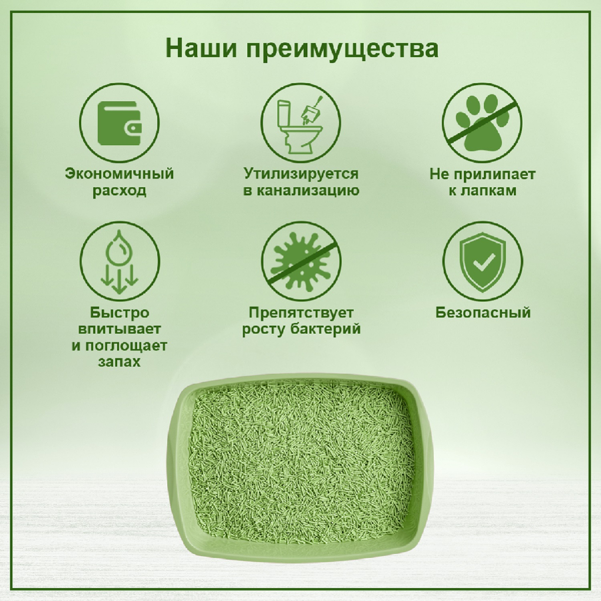 Экологически чистый, безопасный и на 100% биоразлагаемый, изготовленный из растительного сырья, комкующийся наполнитель для кошачьих туалетов. С повышенной способностью водопоглощения и блокирования запаха. Безопасен для животного и человека. Поддерживает чистоту кошачьего туалета длительное время, подавляет запах, предотвращает рост бактерий. Обладает повышенным адсорбирующими свойствами, отлично удерживает влагу и запах внутри комка. Легкое удаление комков. Сверх низкое содержание пыли. Натуральное сырье характеризуется приятной мягкостью и максимальным отсутствием пыли, обеспечивает приятные ощущения для кошачьих лап и органов дыхания. При производстве используется термообработка для уничтожения вредных микроорганизмов. Проходит несколько тестов безопасности. Добавление натуральных ароматизаторов позволяет долго поддерживать приятный аромат наполнителя. Вакумная упаковка предотвращает появление бактерий и микроорганизмов. Сверхбыстрое образование комка, который легко удаляется из кошачьего туалета. Впитывает во много раз больше собственного объема. Образовавшиеся комочки после уборки можно утилизировать непосредственно в унитаз. Состав Обезжиренная соевая пудра - 80%, кукурузный крахмал - 10%, зеленый чай - 7%, гуаровая камедь - 2,5%, другое 0,5%.