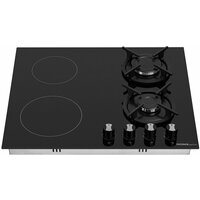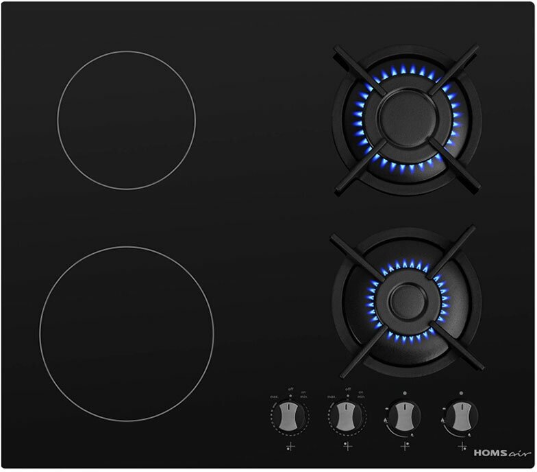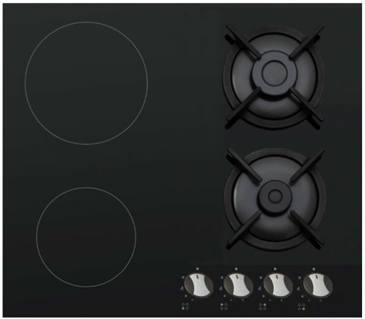 Встраиваемая варочная поверхность 60 см комби "Черное стекло" (Газ на стекле + стеклокерамика) Комбинированная варочная поверхность, оснащенная 2 турецкими газовыми конфорками ALBEK (с матовыми крышками) и 2 электрическими конфорками, автоматической системой поджига, газ-контролем и чугунными решётки (круглые), подходит для сжиженного/ натурального газа (набор форсунок прилагается). Рабочая поверхность выполнена из закаленного стекла.