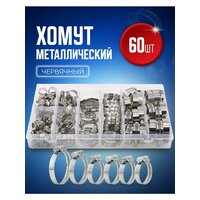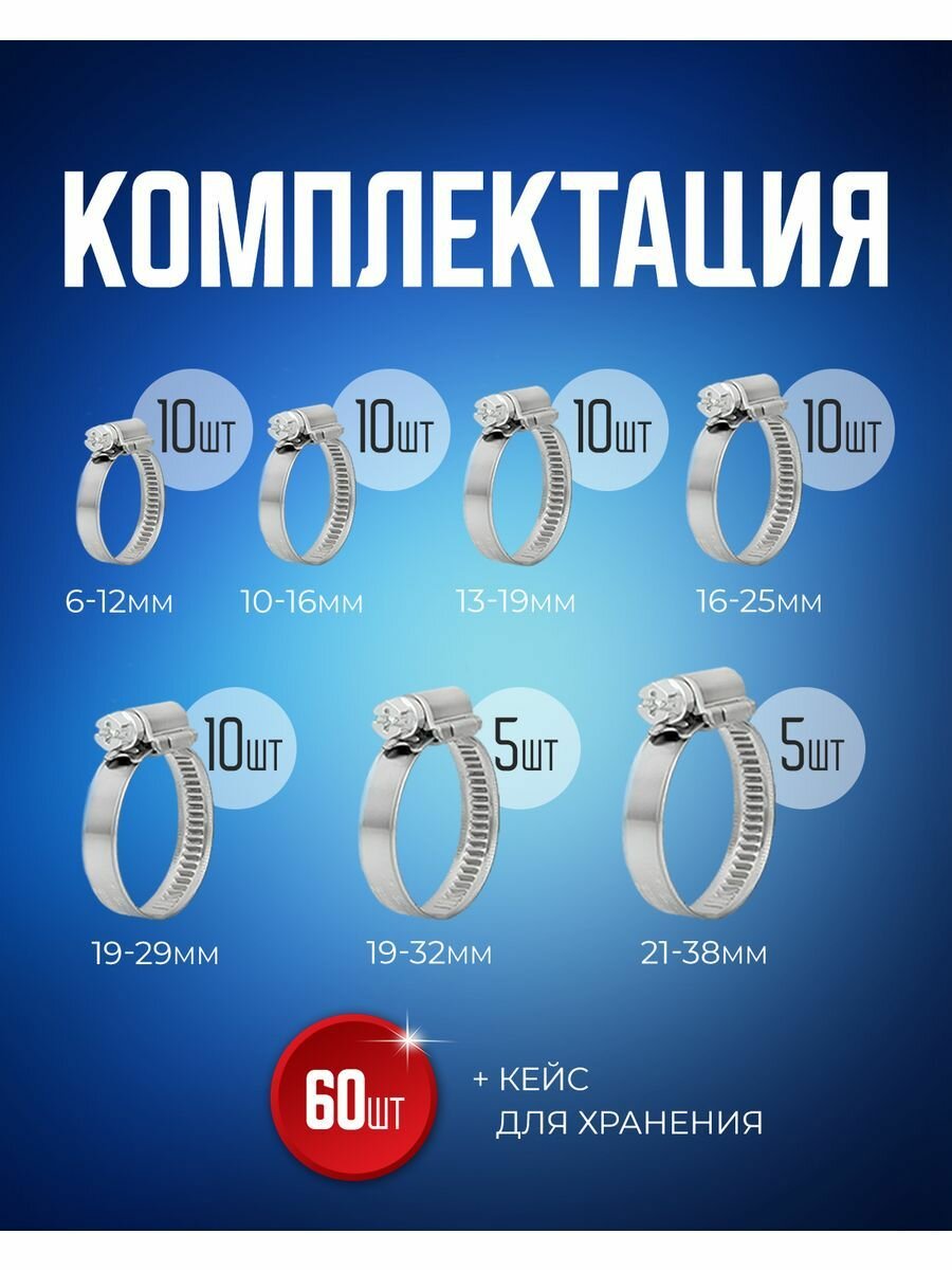 Хомут обжимной металлический червячный набор 7 размеров 60 штук 6-12, 10-16, 13-19, 16-25, 19-29, 19-32, 21-38 мм, оцинкованный для крепления шланга и труб, в пластиковом кейсе