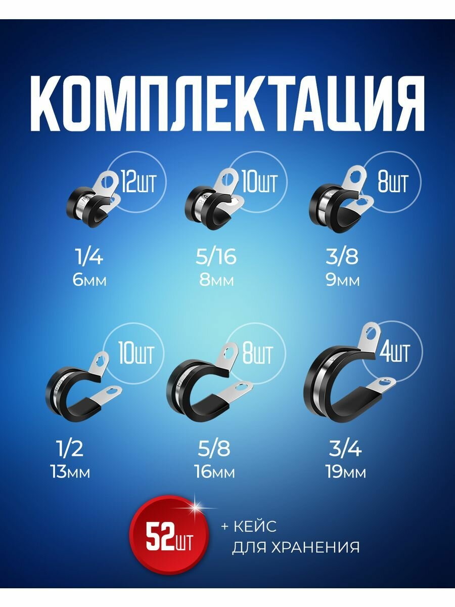 Резиноармированный трубный хомут широко применяется при сборке различных агрегатов, для крепления трубопроводов высокого давления, а также используется при сборке двигателей и различных силовых агрегатов. Обрезиненные скобы хомута Руббер пригодны для крепления различной арматуры, кабелей, трубопроводов и проводов, шлангов и т. п. Набор хомутов в пластиковом кейсе предназначен для использования в различных бытовых и профессиональных целях. В комплект входит 6 размеров хомутов с резиновой прокладкой, которые можно использовать для крепления различных предметов, проводов, шлангов и труб. Хомуты легко регулируются и обеспечивают надежное крепление.