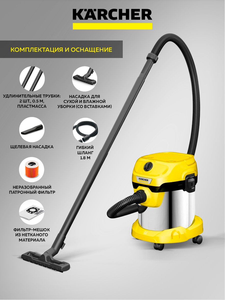 | В комплекте | насадка для автомобиля, насадка для ламината и паркета, насадка для мягкой мебели, насадка для прочистки сифонов и труб, насадка для твердых покрытий мебели, угловая насадка, удлинительная трубка/шланг, универсальная насадка для влажной уборки, универсальная насадка для сухой уборки, щелевая насадка |