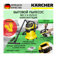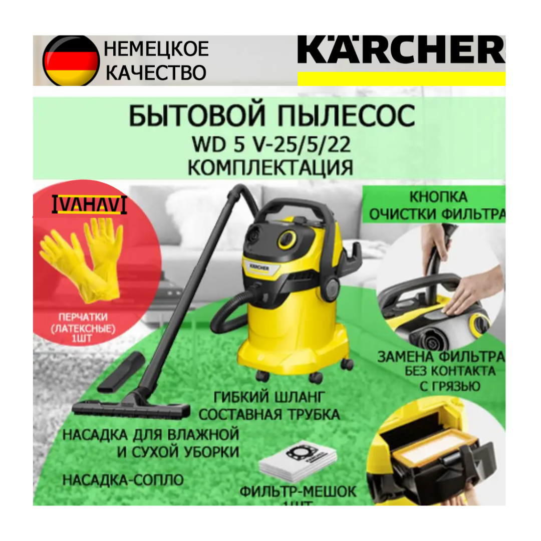 Хозяйственный пылесос Karcher WD 5 V-25/5/22 1.628-300 + латексные перчатки: сравнение цен, характеристики, фото, актуальное наличие и цены.