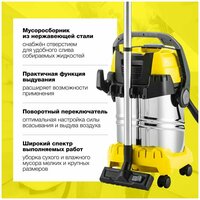 Аппарат отличается максимальной эффективностью и самой богатой комплектацией среди бытовых пылесосов сухой и влажной уборки Karcher. Оснащён баком из нержавеющей стали объёмом 30 литров, всасывающим шлангом длиной 2,2 метра, кабелем длиной 6 метров, а также плоским складчатым фильтром, который установлен в кассете для легкого и быстрого извлечения без контакта с мусором. Запатентованная система очистки фильтра мгновенно (нажатием кнопки) восстанавливает высокую силу всасывания.