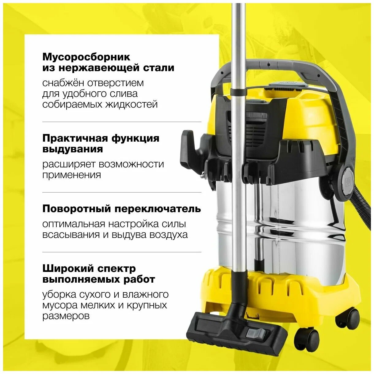 Karcher WD 6 P S V-30/6/22/T - лучший представитель модельного ряда. С его помощью можно выполнять любую уборку в доме, гараже, мастерской, перед домом, а также собирать большие объемы жидкой грязи.