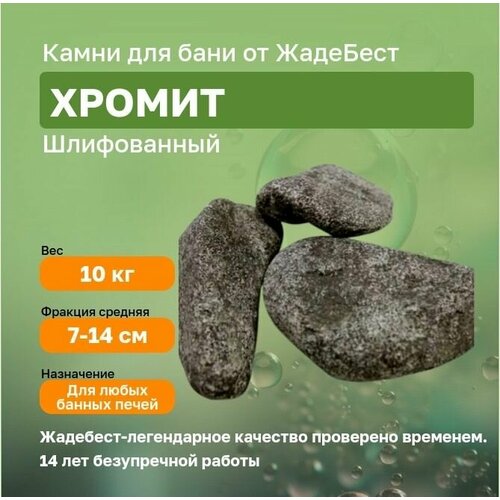 Происхождение и особенности обработки Шлифованный хромит, добытый на Урале, выделяется высокой плотностью и устойчивостью к экстремально высоким температурам. Шлифовка придаёт камню гладкую, ровную поверхность, удаляя мелкие трещины и делая минерал более прочным и долговечным. Благодаря отсутствию острых углов, хромит удобно укладывается в каменку, улучшая циркуляцию тепла и создавая ровное распределение. Поскольку шлифовка — это пыльный процесс, камень может сохранять незначительный налёт пыли. Это никак не влияет на его надёжность и прочность, которые остаются на высоком уровне.
