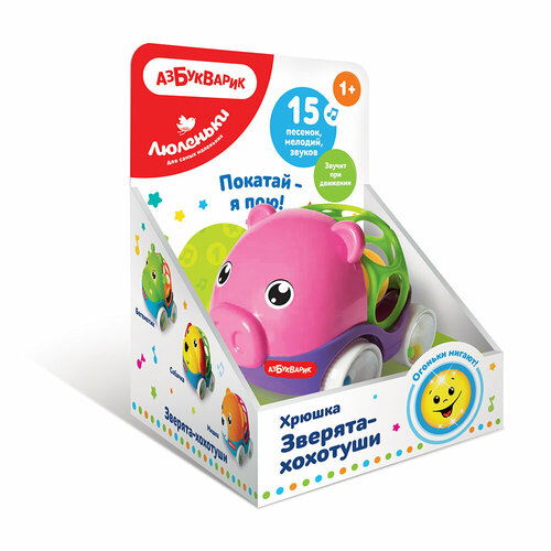 Вот так чудо-игрушка! Это и машинка, и зверюшка, да еще и с музыкальным мячиком внутри! Покатай забавную свинку – она звучит при движении! Слушай веселые песенки («Давай играть и не скучать», «Зверюшки», «Догони»), мелодии и звуки. Колесики звенят, как погремушка, огоньки мигают, а мягкую спинку так приятно потрогать пальчиками. Отличный подарок для годовалых малышей и постарше! Игра с этой милой свинкой на колесиках не только развлекает ребенка, но и развивает у него музыкальные способности, двигательную активность, тактильные ощущения. 3AG13/LR44 (в комплекте демонстрационные)