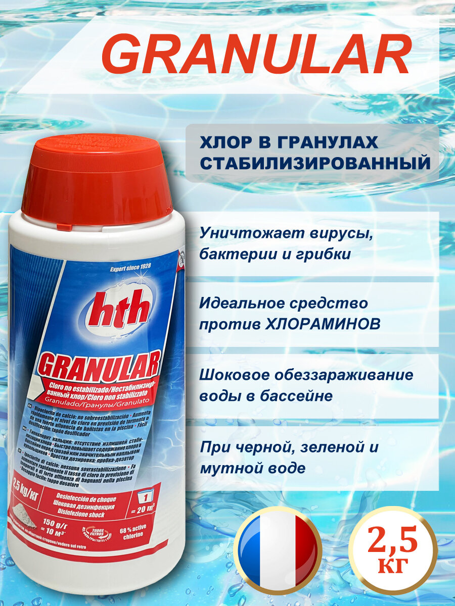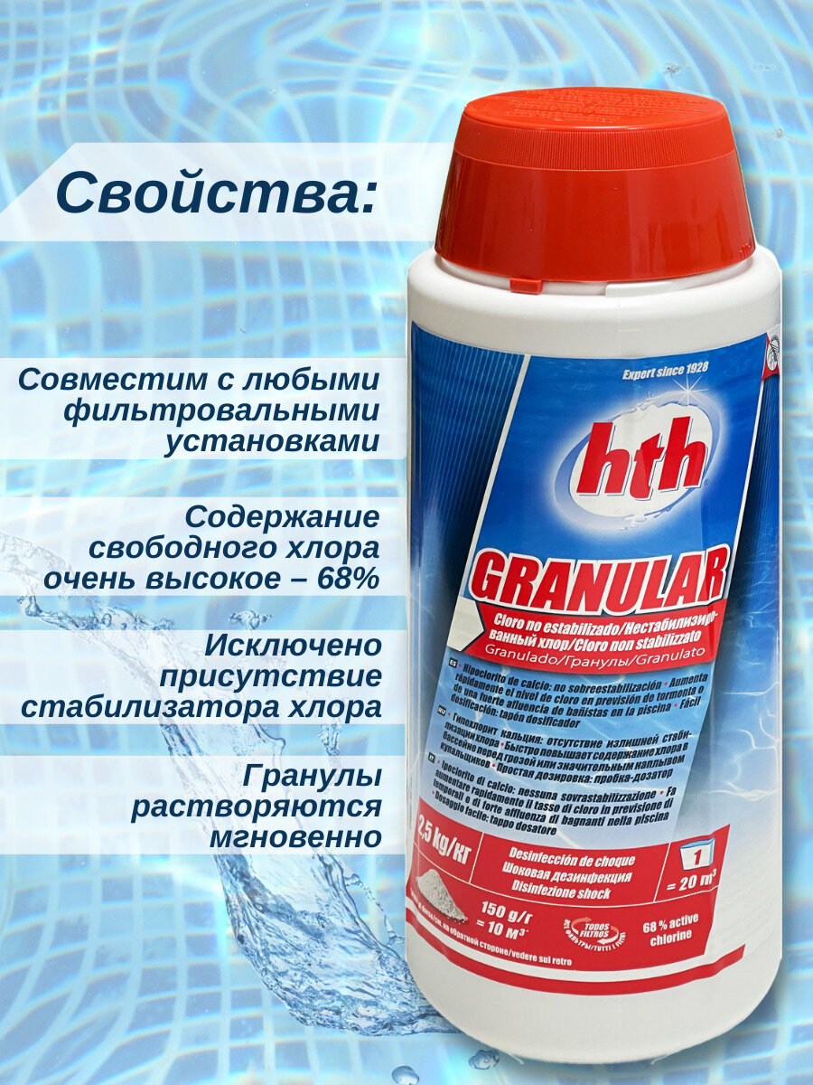 Быстрорастворимые гранулы на основе гипохлорита кальция. Препарат предназначен для обработки частных и общественных бассейнов. Уничтожает в воде бактерии, вирусы и грибки. Не вызывает излишней стабилизации хлора.