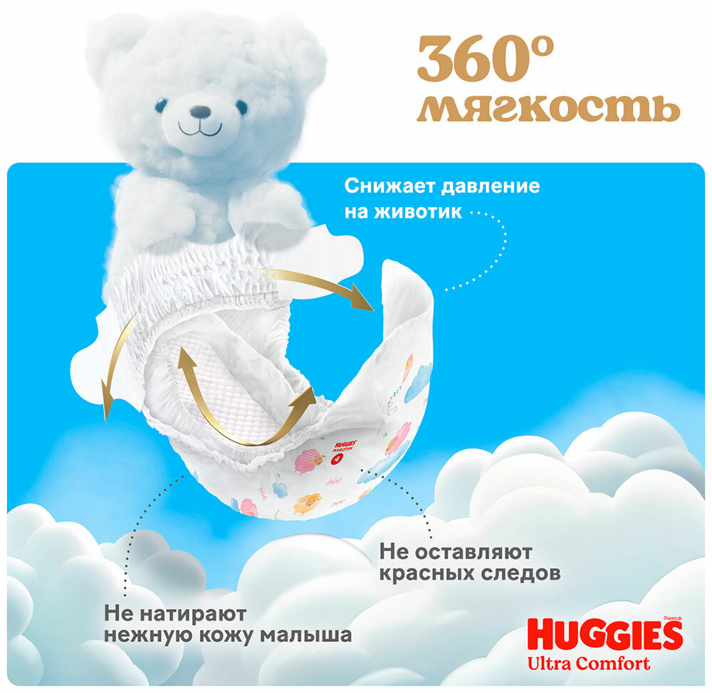 - Подгузники обладают мягкостью на 360°, что обеспечивает комфорт на протяжении всего дня.
