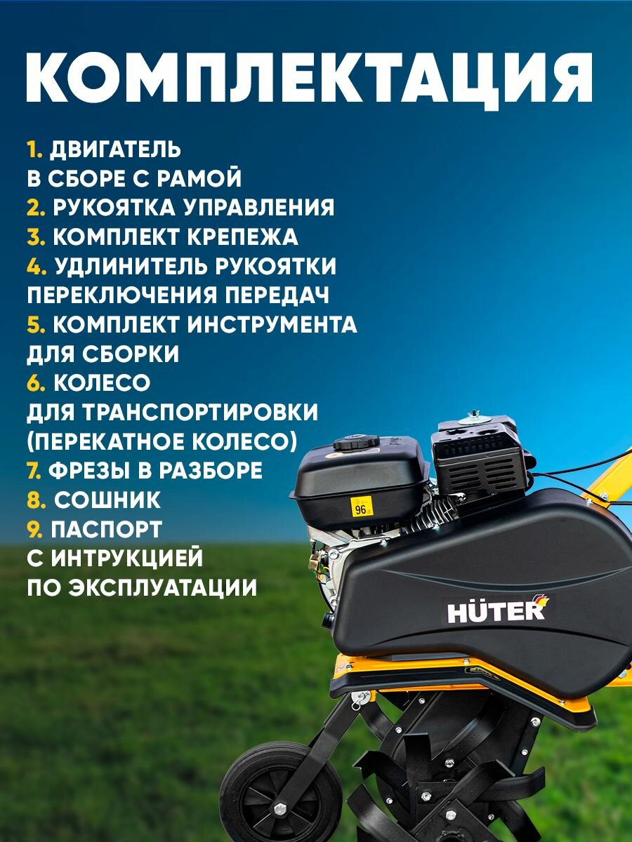 | Комплект поставки | Двигатель в сборе; Ручка управления в разборе; Комплект крепежа; Комплект инструмента (Ключ свечной. Шестигранник. Отвёртка); Колесо для транспортировки (перекатное колесо); Фрезы в разборе; Сошник; Руководство по эксплуатации. |