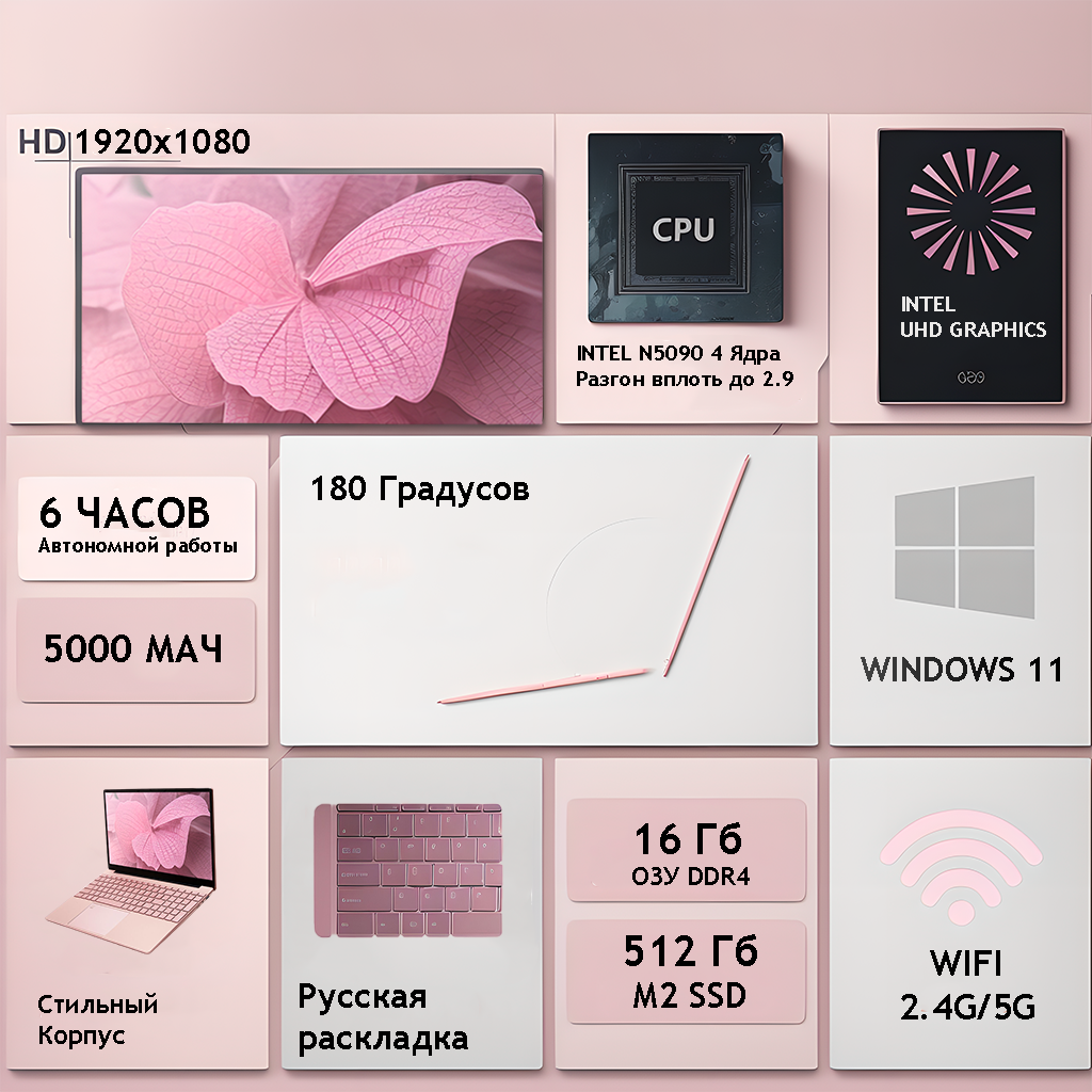 Ноутбук 15.6″, Intel Celeron N5095 (2.9 ГГц), RAM 16 ГБ, SSD 512 ГБ, Intel UHD Graphics, Windows 11 Pro, Розовый, Русская раскладка: сравнение цен, характеристики, фото, актуальное наличие и цены.
