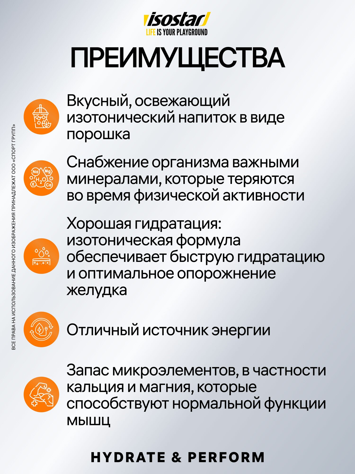 Hydrate & Perform от Isostar – это изотонический энергетический напиток с точно подобранной дозировкой углеводов и натрия для обеспечения оптимального водно-солевого баланса в организме, и в качестве превосходного источника энергии.