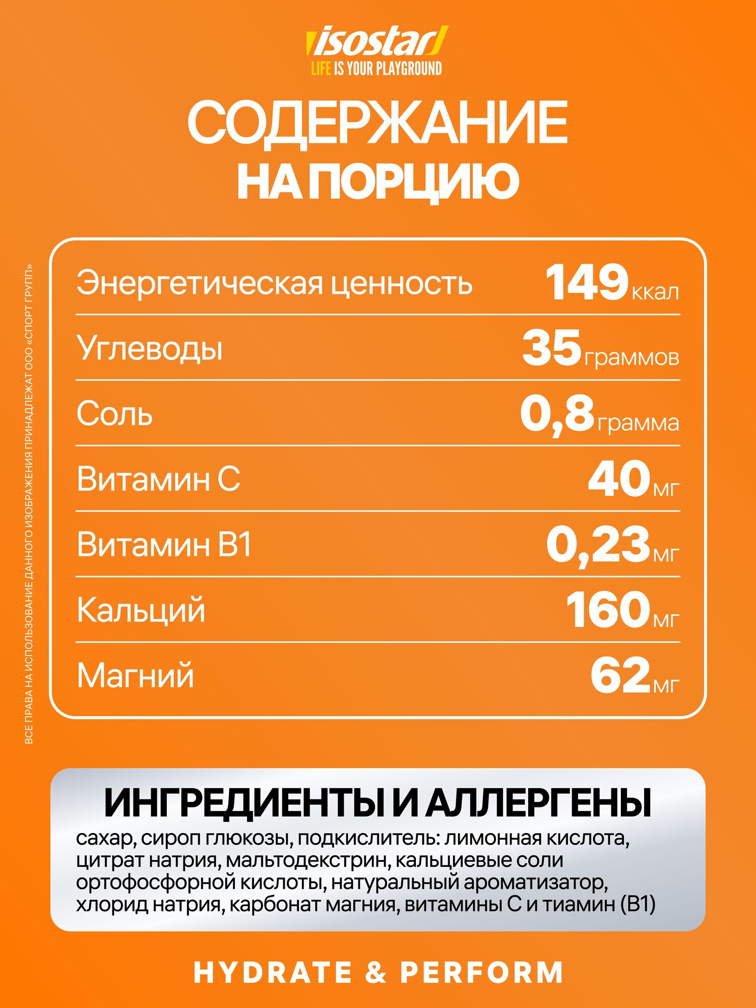 HYDRATE AND PERFORM Powder: Порошок для приготовления изотонического напитка для физической нагрузки средней продолжительности (< 2 часов). Исследовательский центр Isostar доказал, что формула Hydrate & Perform улучшает работоспособность спортсменов на 19% (в сравнении с плацебо). Содержит простые и сложные углеводы, которые обеспечивают энергией в течение физической нагрузки, витамины и минералы для восстановления водно-солевого баланса, а так же обеспечения оптимального использования углеводов и хорошего восстановления.