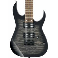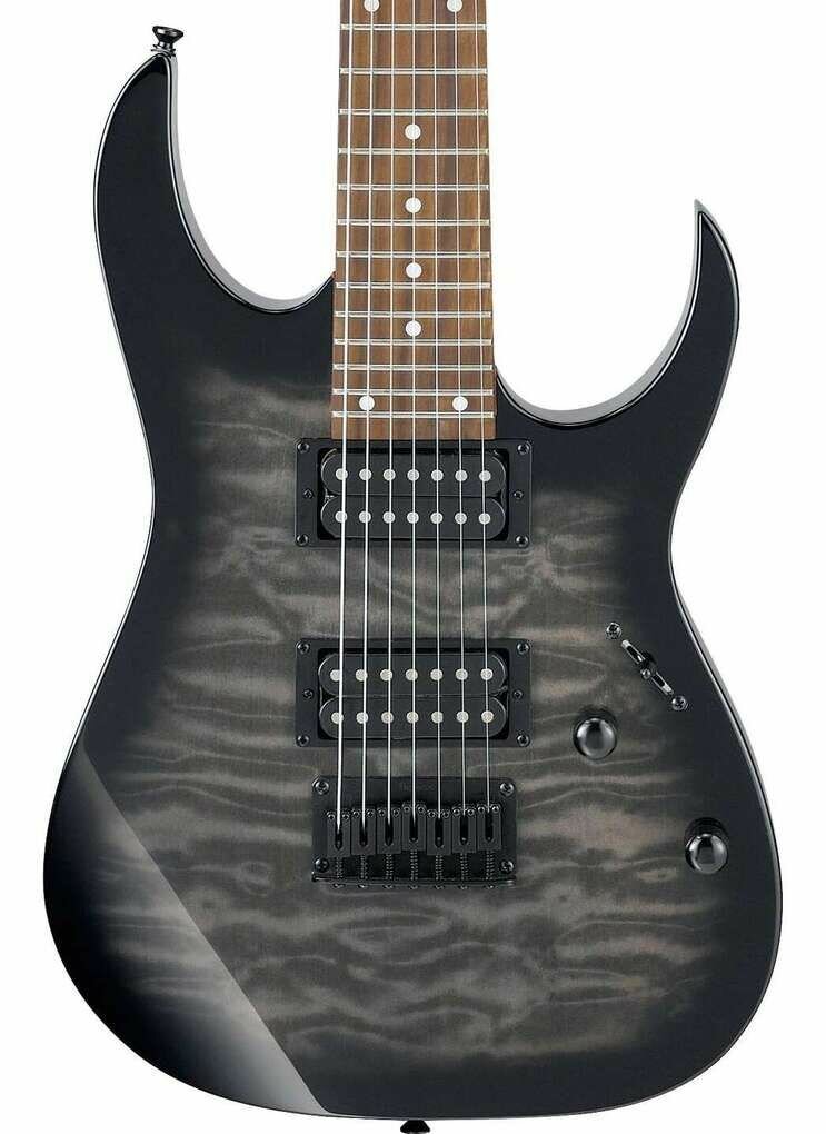 IBANEZ GRG7221QA-TKS – семиструнная электрогитара из самой узнаваемой линейки знаменитого японского производителя RG. Этот инструмент может похвастаться хорошим качеством материалов и отличным звуком, несравнимыми с другими инструментами такой же ценовой категории, наглядно доказывая, что гитара с хорошим звучанием вовсе не обязательно должна дорого стоить. Серия RG GIO была специально разработана для начинающих гитаристов, которые хотят получить качественный инструмент по демократичной цене. Представленная модель прошла точно такую же тщательную проверку качества материалов и сборки, как и более дорогие инструменты линейки. Лёгкая изящная дека сделана из древесины тополя с эффектным топом из волнистого клена. Гриф гитары профиля GRG7 – кленовый. Накладка на гриф – из специальным образом обработанной новозеландской сосны. На грифе 24 лада Jumbo с инкрустацией белыми точками. За звук инструмента отвечают два хамбакера Infinity R. Звукосниматели пассивные, открытого типа, черного цвета, с керамическими магнитами. Переключатель – 5-позиционный. Элементы управления лаконичны: громкость и тембр. Бридж – фиксированный Ibanez F107. Модель представлена в элегантном серо-черном цвете «Transparent Black Sunburst», выгодно демонстрирующем красивую фактуру кленового топа, с черной головой грифа, хромированной фурнитурой.