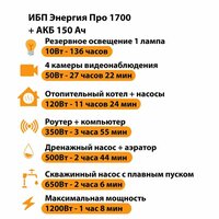 Купить ИБП для котла Энергия Про 1700 + Аккумулятор 150 Ач 12 В (1200Вт — 68мин) с доставкой по всей России. ИБП для котла Энергия Про 1700 + Аккумулятор 150 Ач 12 В (1200Вт — 68мин): сравнение цен, характеристики, фото, актуальное наличие и цены.