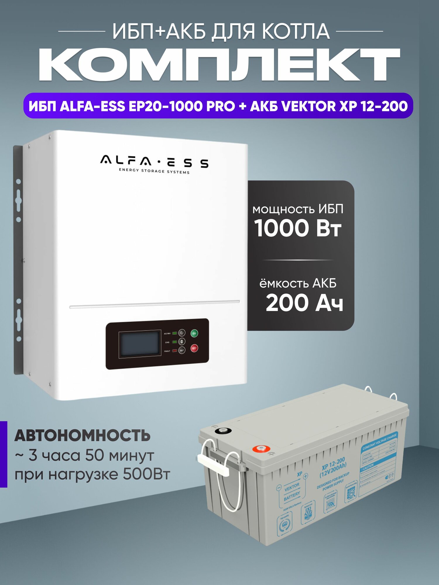 ИБП для котла с аккумулятором ИБП ALFA-ESS EP20 PRO 1000Вт, 12В + АКБ Vektor Energy XP 200Ач, 12В / бесперебойник для котла отопления / источник бесперебойного питания