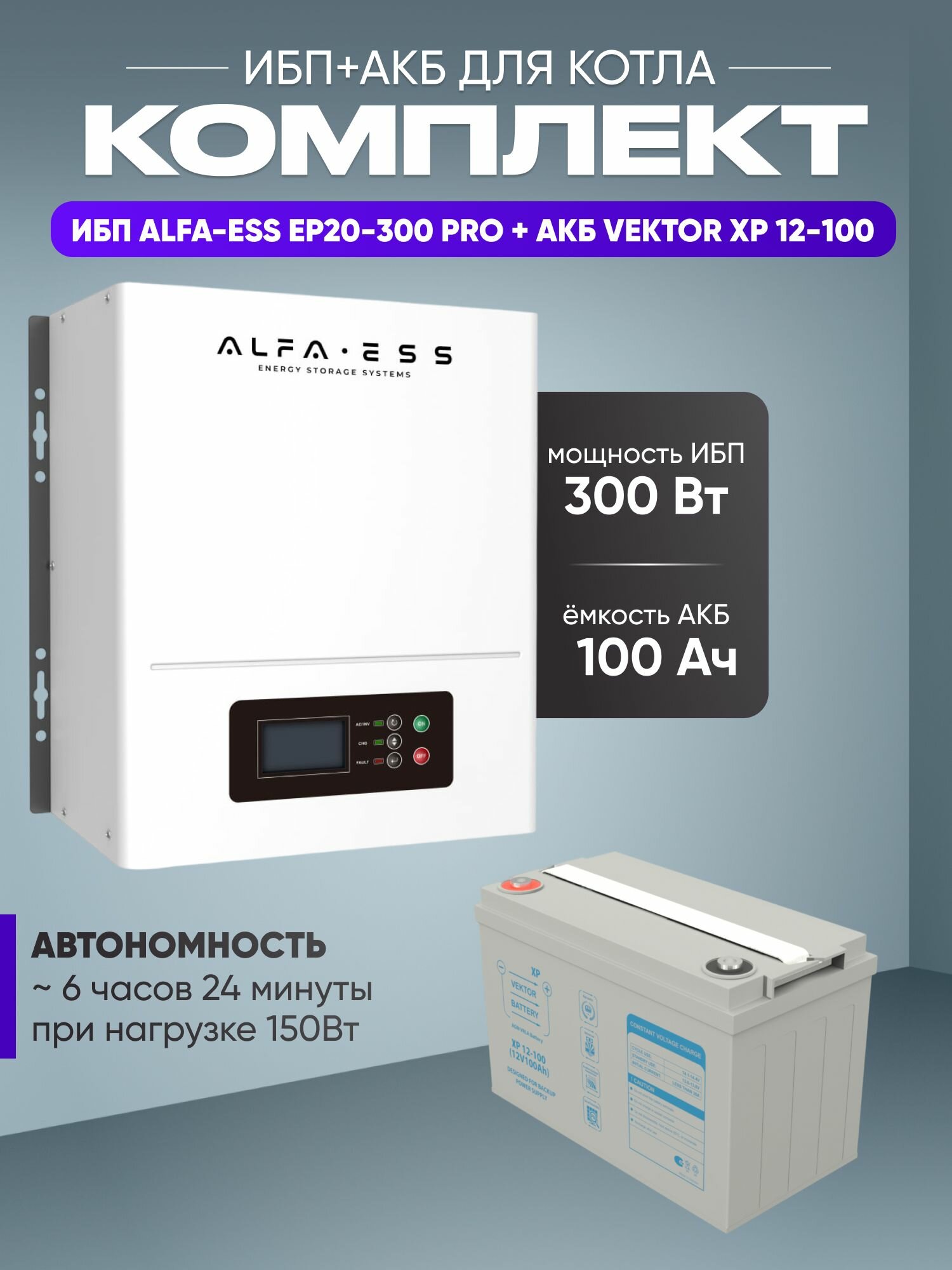 ИБП для котла с аккумулятором ИБП ALFA-ESS EP20 PRO 300Вт, 12В + АКБ Vektor Energy XP 100Ач, 12В / бесперебойник для котла отопления / источник бесперебойного питания