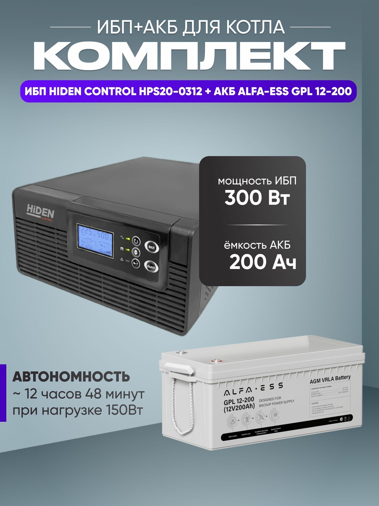 Купить ИБП для котла с аккумулятором ИБП Hiden Control HPS20 300Вт, 12В + АКБ ALFA GPL 200Ач, 12В / бесперебойник для котла отопления / источник бесперебойного питания с доставкой по всей России.